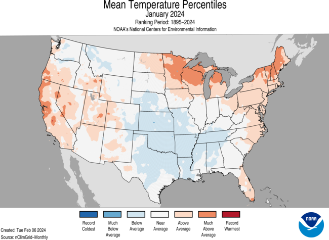 This monthly summary from NOAA’s National Centers for Environmental Information is part of the suite of climate services NOAA provides to government, business, academia and the public to support informed decision-making. For more detailed climate information, check out our comprehensive January 2024 U.S. Climate Report scheduled for release on February 13, 2024. For additional information on the statistics provided here, visit the Climate at a Glance and National Maps webpages.