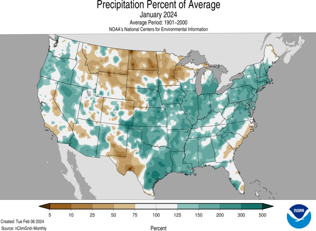 - January 2024 was the 10th-wettest January on record for the nation, and temperature ranked in the middle third of the historical record for the month.