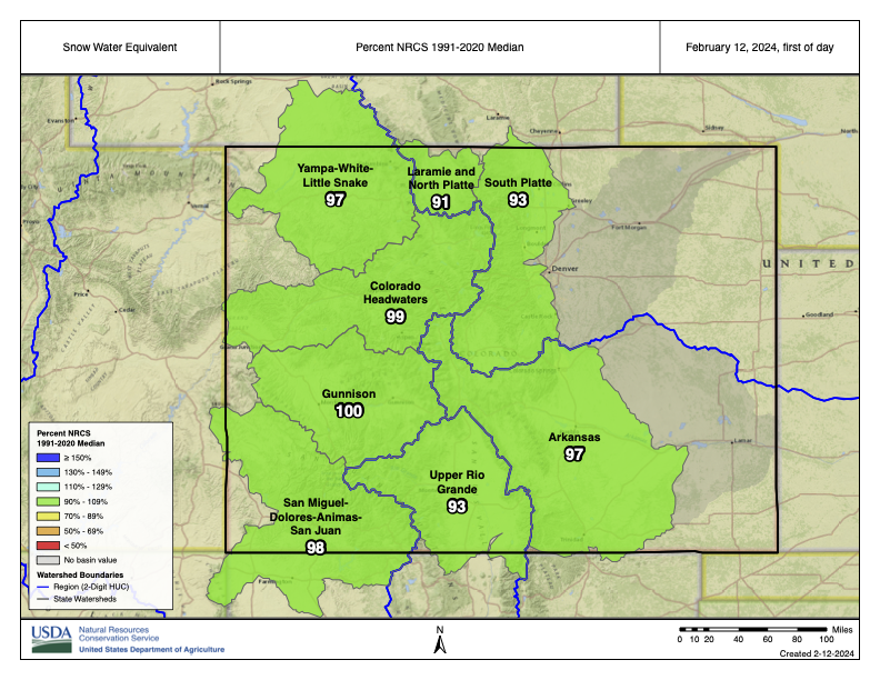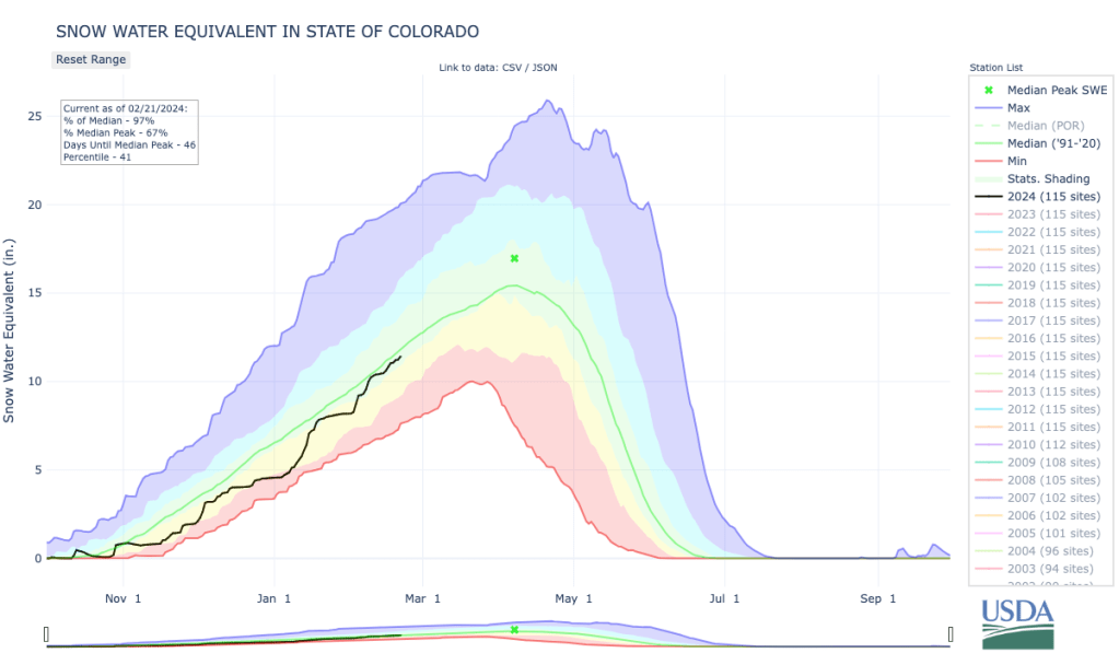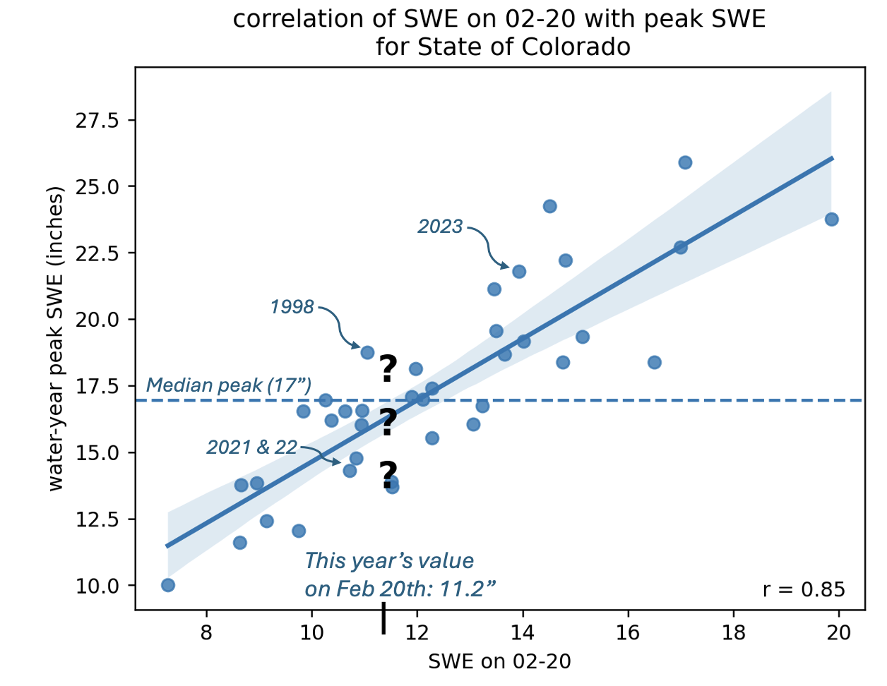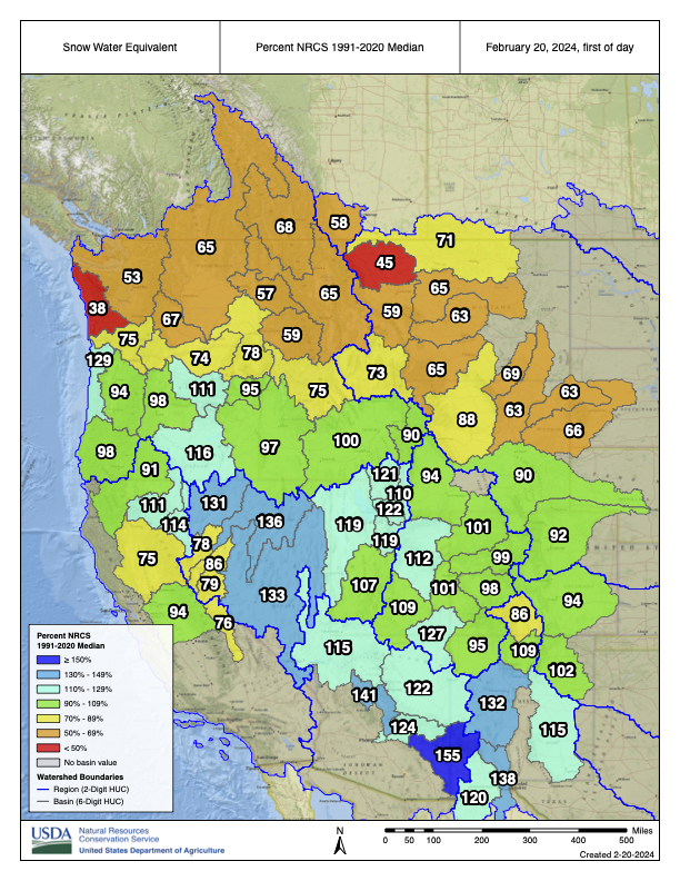 We spend a lot of time thinking about snow in our mountains, because Colorado is a headwaters state, and the water stored in that snowpack ends up serving ecosystems, farms, and millions of people not just in Colorado but in all directions. As we progress toward the end of February, the overall picture of Colorado’s mountain snowpack comes into much clearer focus. As of February 20th, the snow water equivalent (SWE) in Colorado’s mountains, as measured at SNOTEL stations, was 97% of the median value for this day, compared to the 1991-2020 period. The northern mountains were a little bit above average (for example, the Yampa-White basin was at 104% of average), and the southern mountains a bit below (88% of median for the mountain areas feeding the Rio Grande river).
