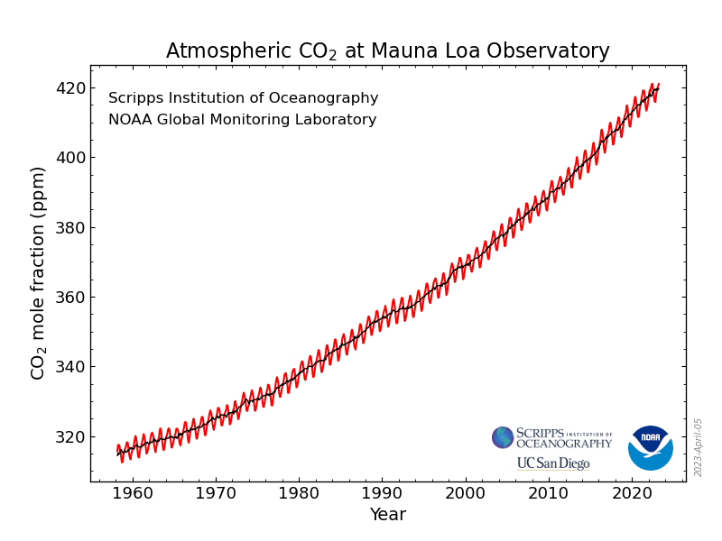 Mauna Loa is WMO Global Atmosphere Watch benchmark station and monitors rising CO2 levels Week of 23 April 2023: 424.40 parts per million Weekly value one year ago: 420.19 ppm Weekly value 10 years ago: 399.32 ppm 📷 http://CO2.Earthhttps://co2.earth/daily-co2. Credit: World Meteorological Organization
