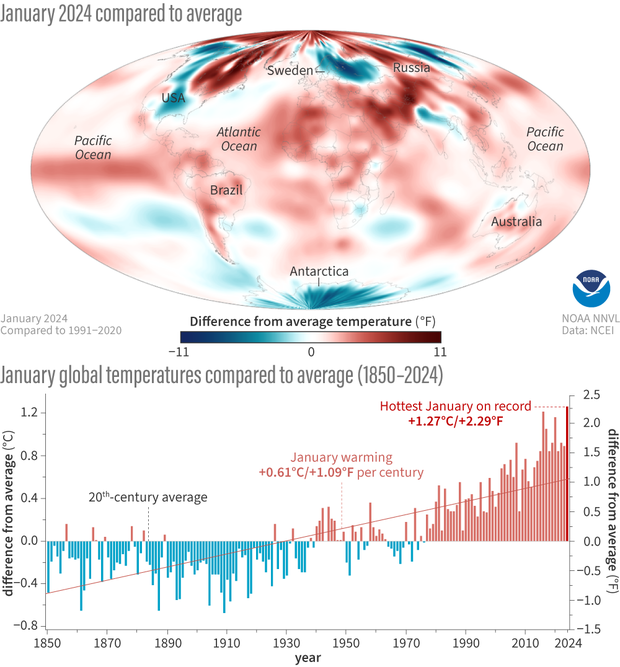 For a deeper dive on January 2024 climate, including circulation patterns, major events, and separate statistics and rankings for Earth’s land and ocean areas, see the full January 2024 monthly report from NOAA NCEI.