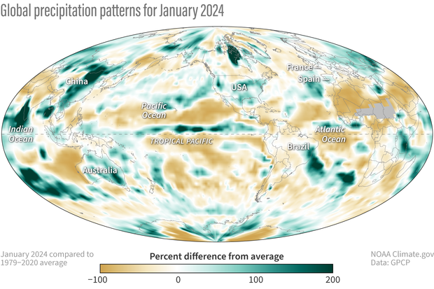 Percent difference from long-term average (1979-present) precipitation in January 2024. Places that were drier than average are brown; places that were wetter than average are green. NOAA Climate.gov map, based on data provided by the Global Precipitation Climatology Project.