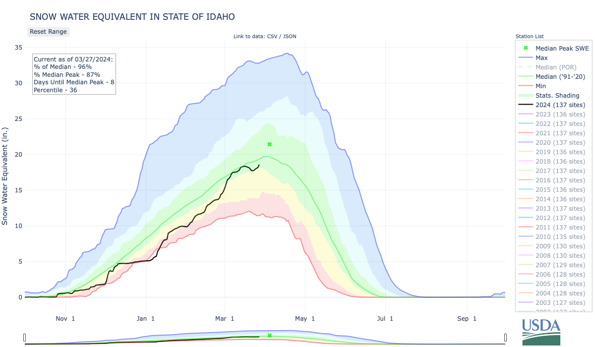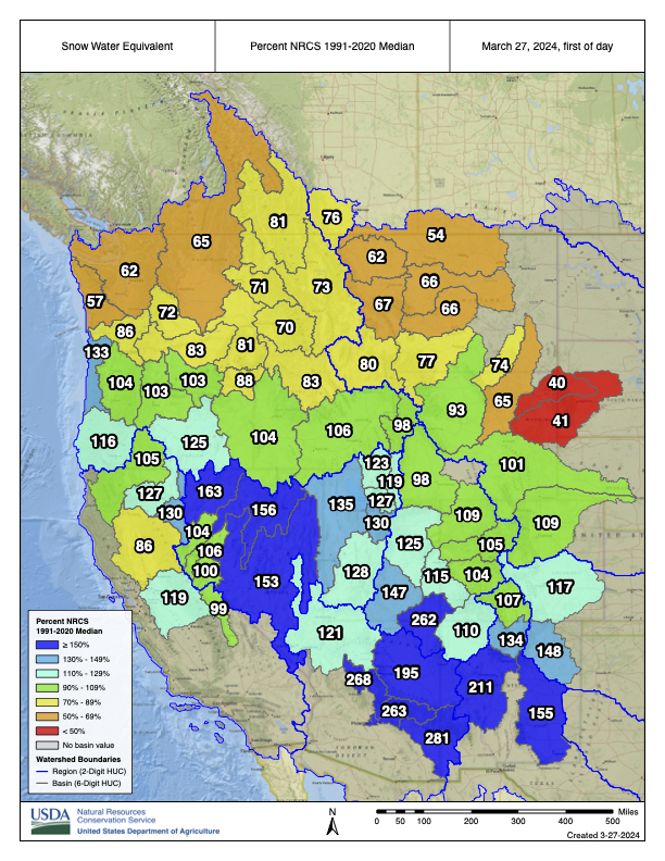 Southwestern Colorado mountains had a combined snow-water level of 103% of the norm in the San Miguel, Dolores, Animas, and San Juan river basins.