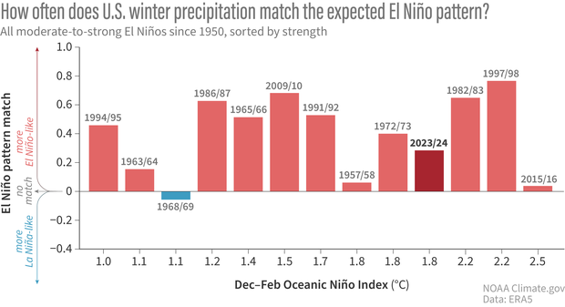 This past winter the pattern correlation was positive and around 0.3, which is a reasonably good match between what we saw and the expected El Niño precipitation pattern. Moreover, most previous moderate-to-strong El Niños matched the expected pattern at least as well as in 2023/24. There are some exceptions, like the winters of 1968/69, 1957/58, and most recently 2015/16, but the figure above supports the general rule that El Niño’s fingerprints are conspicuous whenever El Niño is at least of moderate strength.