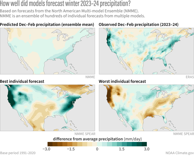 However, if we look at the hundreds of individual forecast maps that went into the ensemble mean, we see the influence of chaotic weather that can either support or oppose the pattern that actually occurred. In fact, if we search the 300+ forecast maps to find the one that best matched the actual pattern this winter (bottom left above), we see that it captured many notable features of this winter, including the very wet conditions in the Pacific Northwest, Mid-Atlantic, and Northeast.