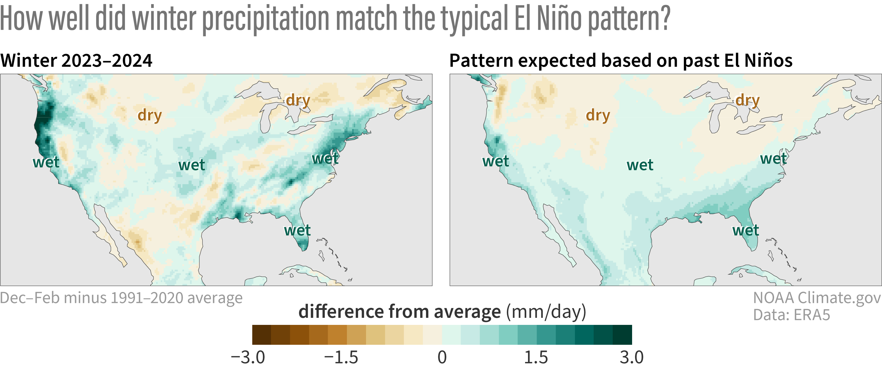 Of course, we shouldn’t just sweep the mismatches under the rug. There were many backyards this winter that did not experience the typical precipitation impacts for an El Niño of this strength. In particular, the Pacific Northwest and Northeast were considerably wetter than the expected El Niño pattern, while portions of the southern tier from southern Texas to the Southeast were notably drier.
