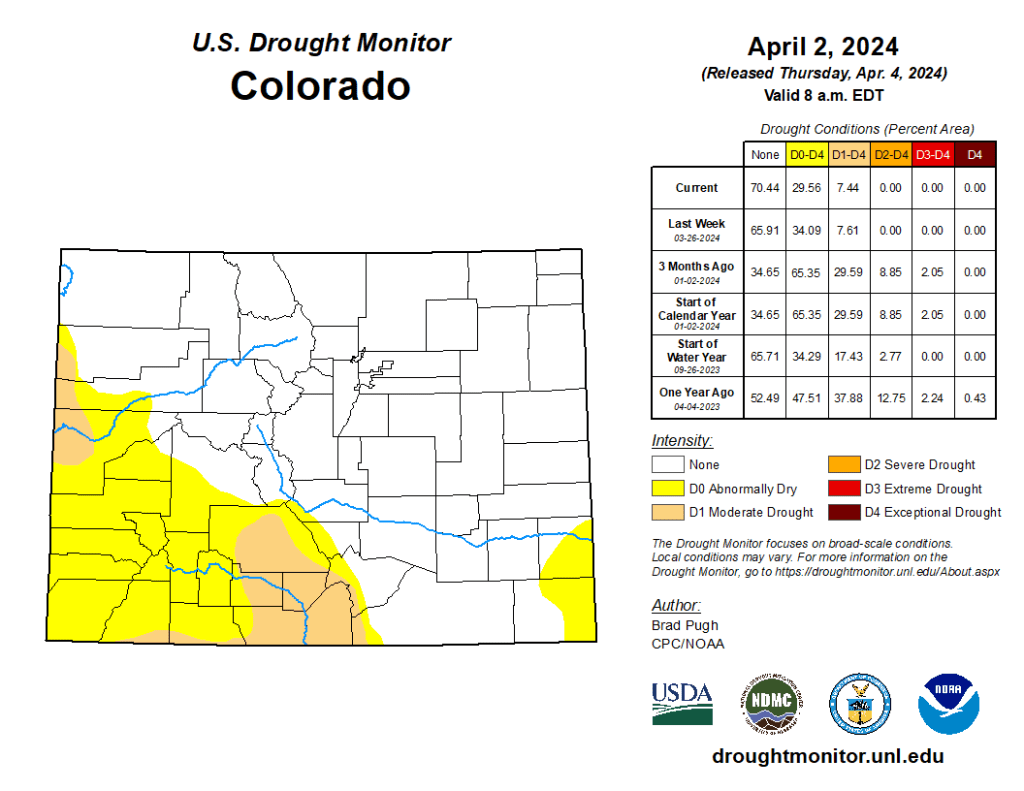 The good news is that the snowpack around Colorado is looking pretty good heading into spring and summer. In fact, more than 70% of the state is reporting no drought conditions, a significant change from the start of this year, when just less than 35% of the state was in zero-drought status…