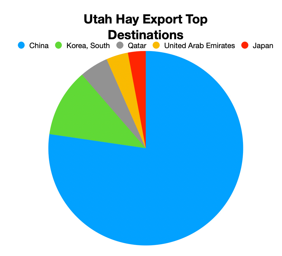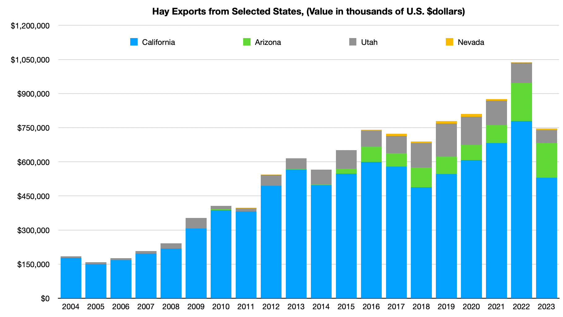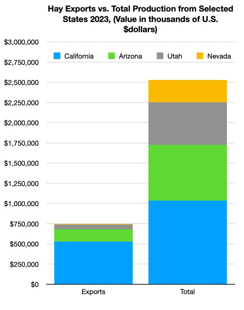 Unfortunately, the FAS only supplies the value of the exports, not tonnage, which makes the comparison a bit squishy, it seems (since producers may fetch more or less per ton for exports). But as far as total value goes, it looks as if about 30% of the hay produced in the main exporting states of the Colorado River Basin is shipped overseas.