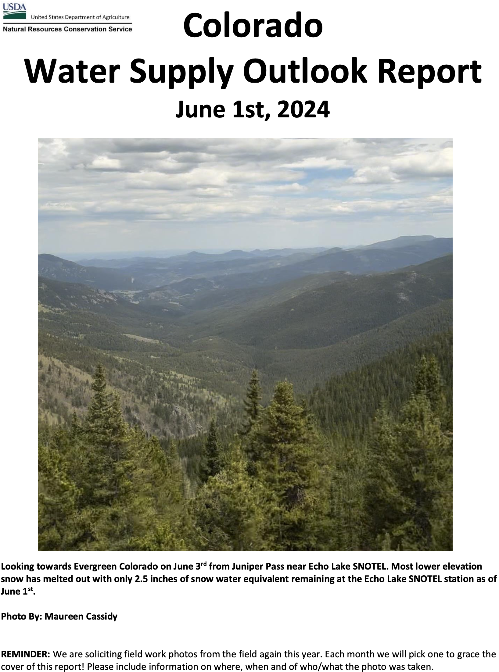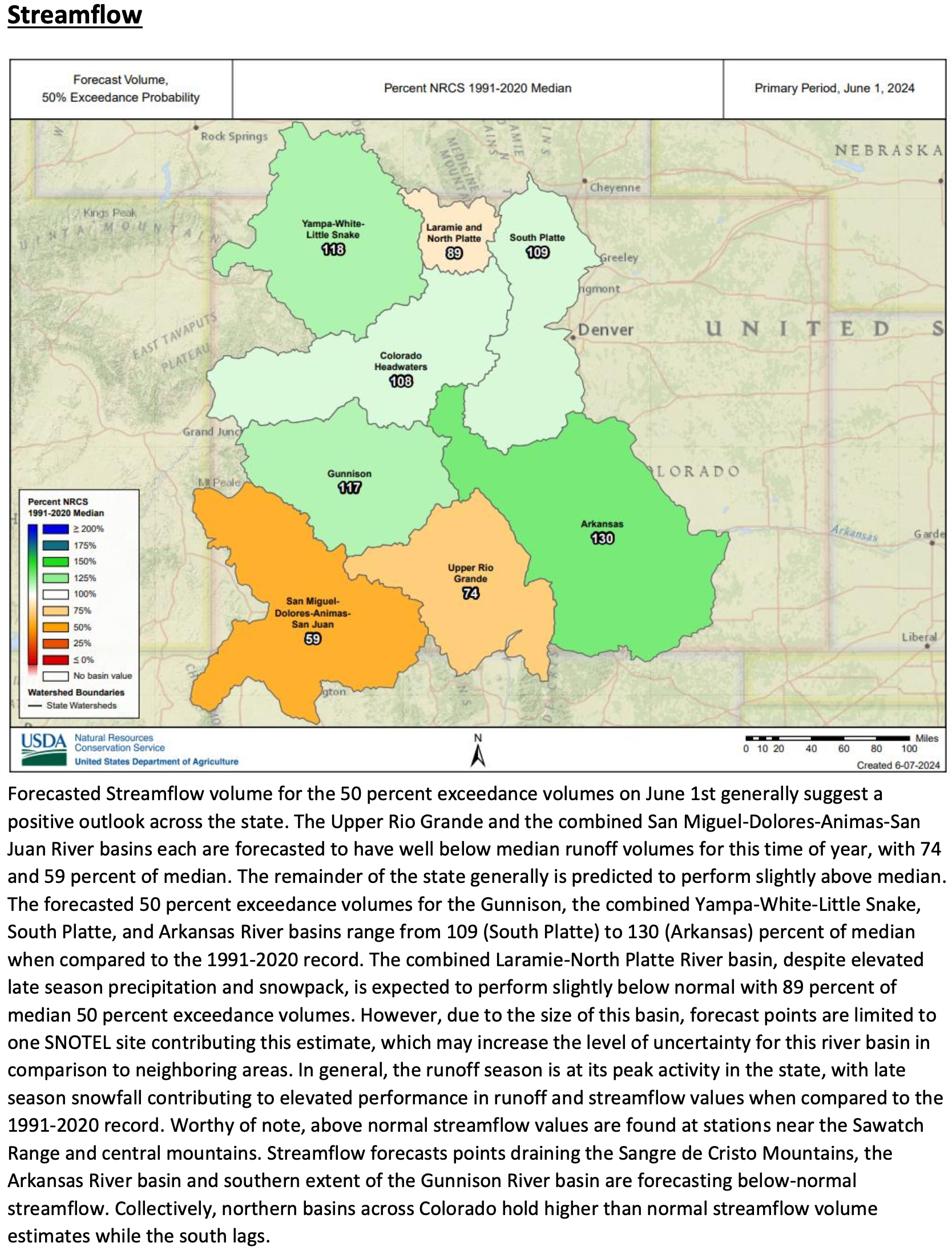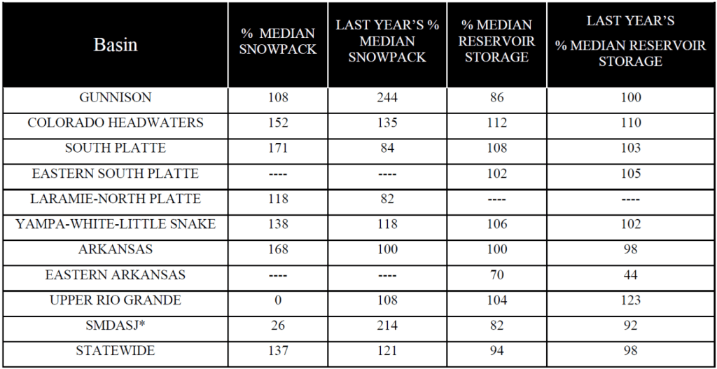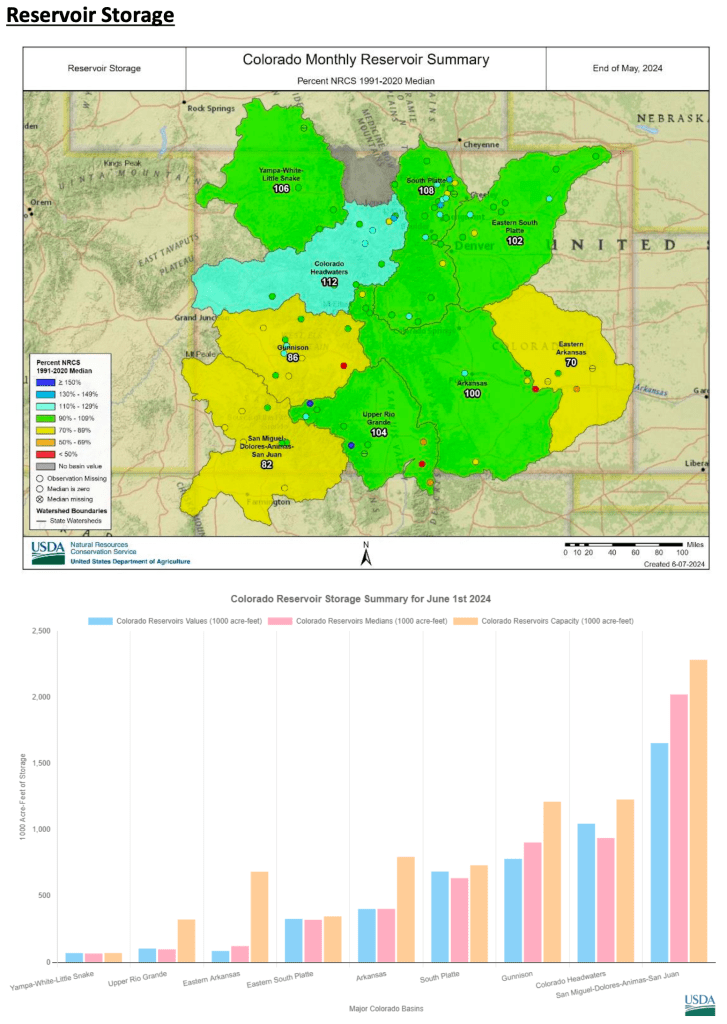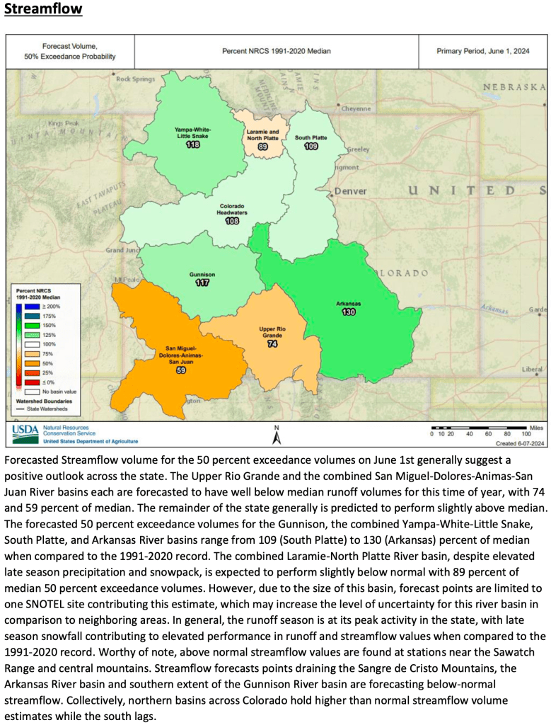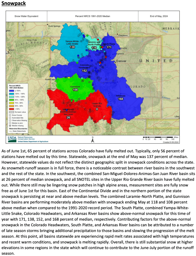 * *For more detailed information about April mountain snowpack refer to the June 1st, 2024 Colorado Water Supply Outlook Report. For the most up to date information about Colorado snowpack and water supply related information, refer to the Colorado Snow Survey website.