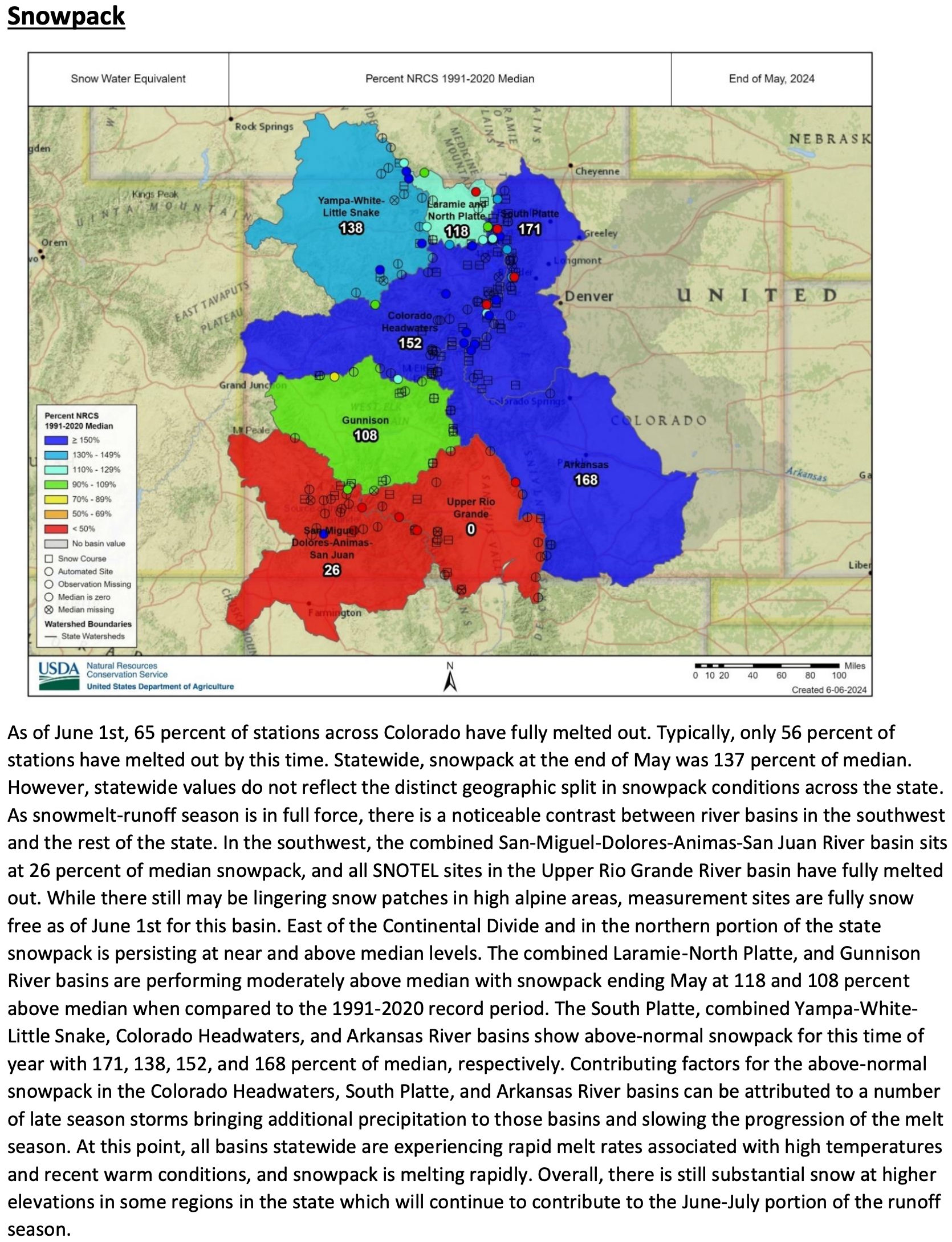 A cooler and wetter May have resulted in all but the Upper Rio Grande and the combined San Miguel-Dolores-Animas-San Juan River basins maintaining an above median snowpack