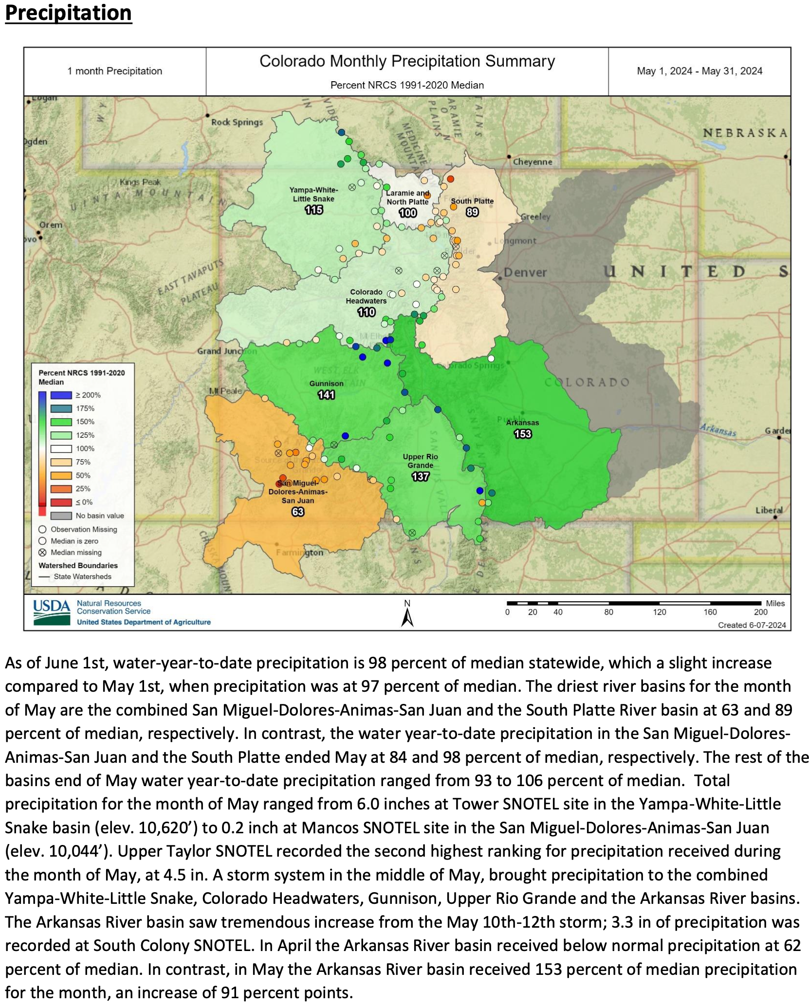 Most of the state received well above median precipitation with a few exceptions. The combined Laramie-North Platte, South Platte, and San Miguel-Dolores-Animas-San Juan River basins each received 100, 89 and 63 percent of median precipitation, respectively. Other basin across the state received much higher totals compared to normal, ranging from 110 percent of median in the Colorado Headwaters River basin to 153 percent of median in the Arkansas River basin. Statewide precipitation during May was above normal at 107 percent of median.