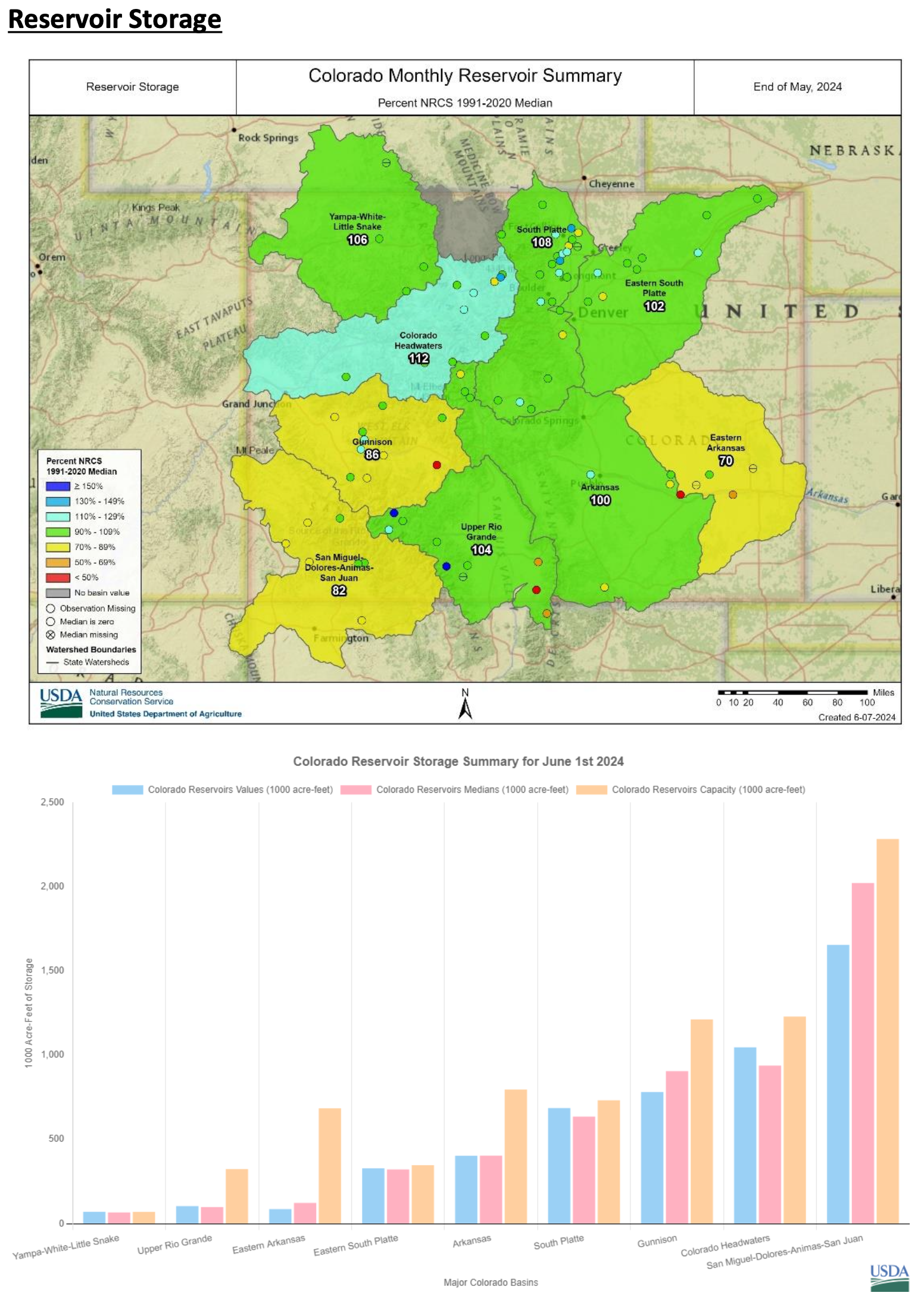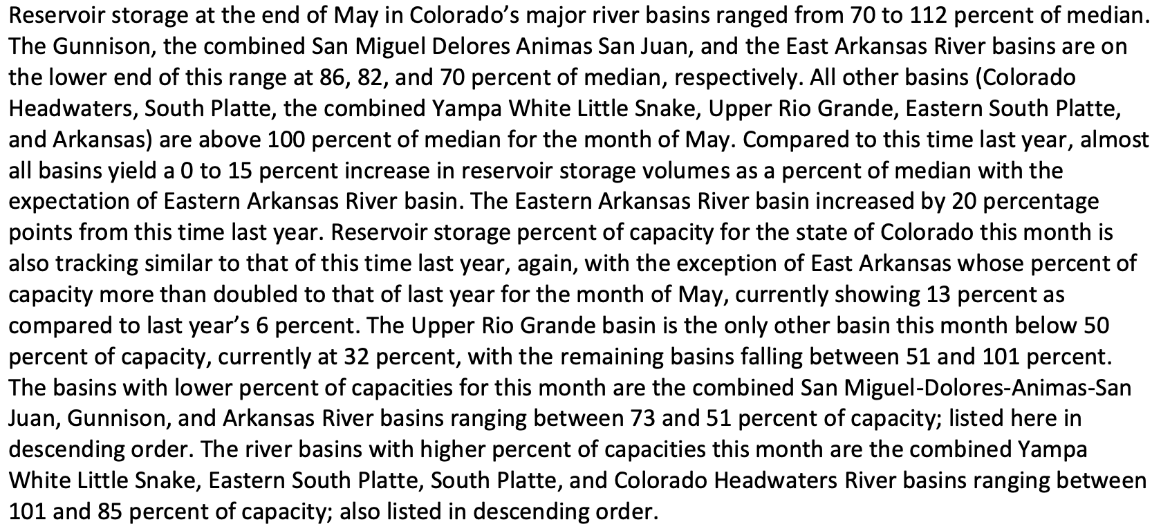 At of the end of May, reservoir storage across Colorado was 94 percent of median. Several basins were reporting above median storage, ranging from 100 percent of median in the Arkansas River basin to 112 percent of median in the Colorado Headwaters River basin. The combined San Miguel-Dolores-Animas-San Juan, Upper Rio Grande and Eastern Arkansas River basins all were reporting below median reservoir storage ranging from 70 percent of median in the Eastern Arkansas River basin to 86 percent of median in the Gunnison River basin.