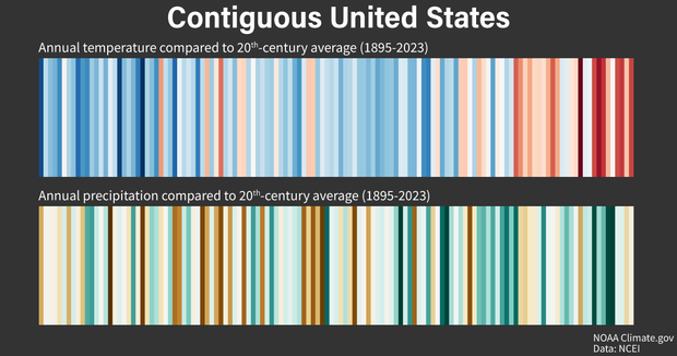 Below are the climate stripes for the contiguous United States. (Alaska and Hawaii aren’t included because their climate records do not go as far back in time as the “Lower 48” states.) According to NOAA National Centers for Environmental Information, the annual average temperature of the United States has warmed at a rate of 0.16 degrees Fahrenheit per decade between 1895 and 2023. The darkest red bar that appears near the right side of the temperature image is the current warmest year on record for the country—2012, when the annual average temperature was 55.28 degrees Fahrenheit, 3.26 degrees warmer than the 20th-century average of 52.02 degrees Fahrenheit.