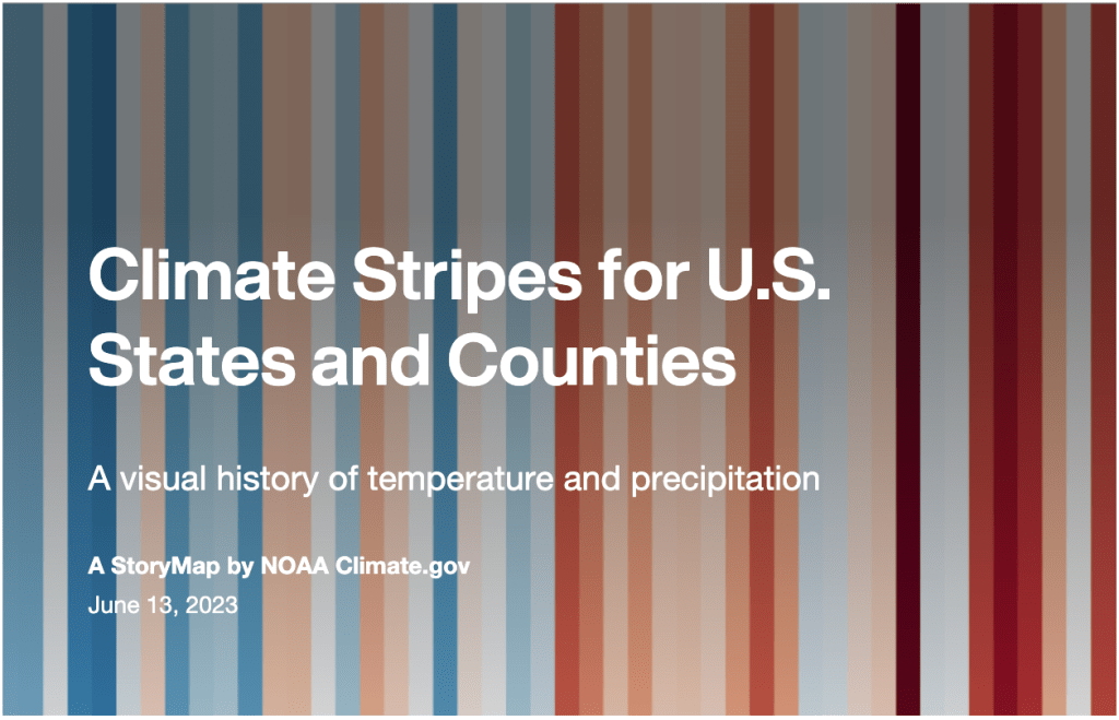 Inspired by Hawkins’ images, our collection of Climate Stripes images is based on the NOAA climate record for U.S. states; counties; Washington, D.C.; and selected stations in Hawaii.