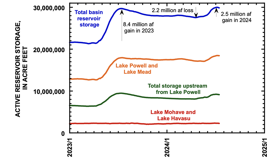 Accumulation of storage in those reservoirs occurred between mid-April and early July 2024, and basin-wide storage increased by 2.5 million acre feet. This amount is only 30% of the increase in storage that occurred during the same period in 2023. Nevertheless, basin-wide reservoir storage increased by 300,000 af when the summer peak of 2024 is compared with the summer peak of 2023, because consumptive uses and losses in the intervening time between the two runoff years was only 2.2 million acre feet. Despite the modest runoff of 2024, water managers were able to increase reservoir storage, because they had done such a good job of limiting consumptive uses following the 2023 runoff season.