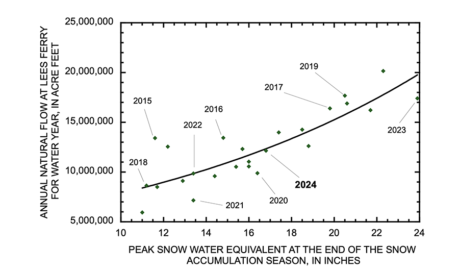 The relation between peak estimated SWE in the Upper Basin and natural flow at Lees Ferry has a reasonably good correlation for data from 2000 and the years of the 21st century (Fig. 2). There is year-to-year variation in this relation caused by springtime weather that affects the rate of melting and the amount of sublimation. Variation is also caused by the intensity of the summer North American monsoon that augments the natural flow but is unrelated to snowmelt. Estimated natural runoff in 2024 was well predicted by the general relation.