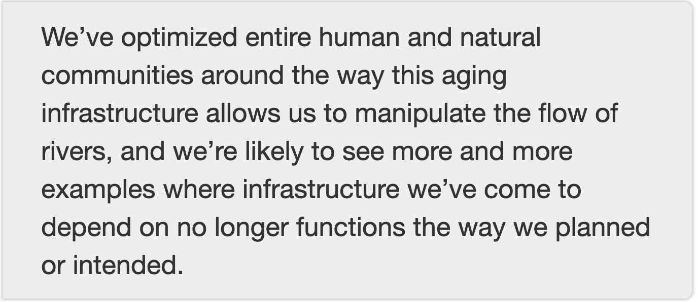 Talking to Jake Bittle for his Grist piece on the trials and tribulations of El Vado Dam, he asked me a question I loved: “What does this mean in the larger scheme of things?”