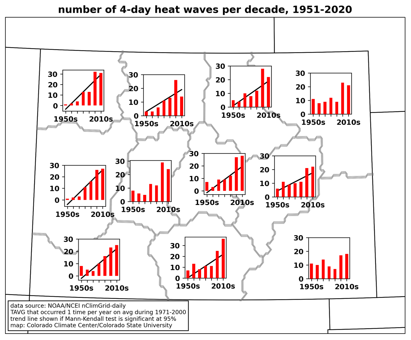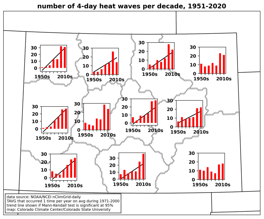 The nClimGrid-daily dataset, which features consistent data processing to allow for analysis of long-term changes, only goes back to 1951, which means it does not include the “dust bowl” era of the 1930s, during which intense heat and drought afflicted the Great Plains. At some individual long-term stations on Colorado’s eastern plains, heat waves in July of 1934 and 1936 still rank as hotter than those in more recent years (although at other stations, those records were surpassed by the June 2012 heat wave.) Grand Junction’s hottest 4-day period came in late July of 1931. Bob Henson and Jeff Masters at Yale Climate Connections recently published an insightful article on why the 1930s were so hot in North America, which includes the effects of poor soil management practices in the Great Plains.