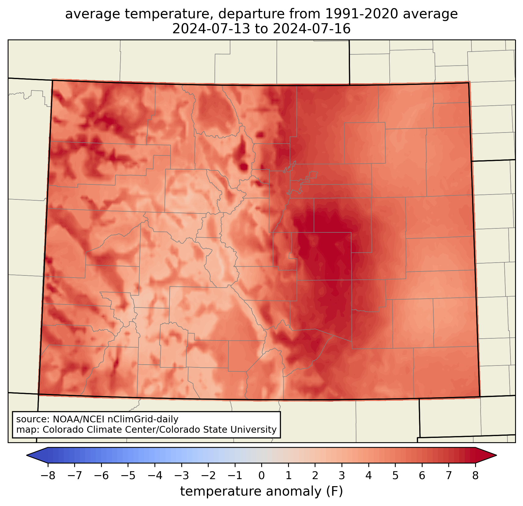The very highest temperatures over this period were in some of the usual places at lower elevations, like the Arkansas Valley in southeast Colorado, and the Grand Valley on the western slope. But because these are Colorado’s usual hot spots, the heat wave wasn’t as extreme compared to average in those areas. The mountains provided their usual respite from the heat. (The long-term station at Dillon made it up to 84°F, which is pretty warm for a location that has never recorded a 90-degree day.) The temperature anomaly map shows that the Urban Corridor saw the most unusually hot conditions. From the Palmer Divide down through Pueblo County, most locations were more than 8°F above average over these four days.