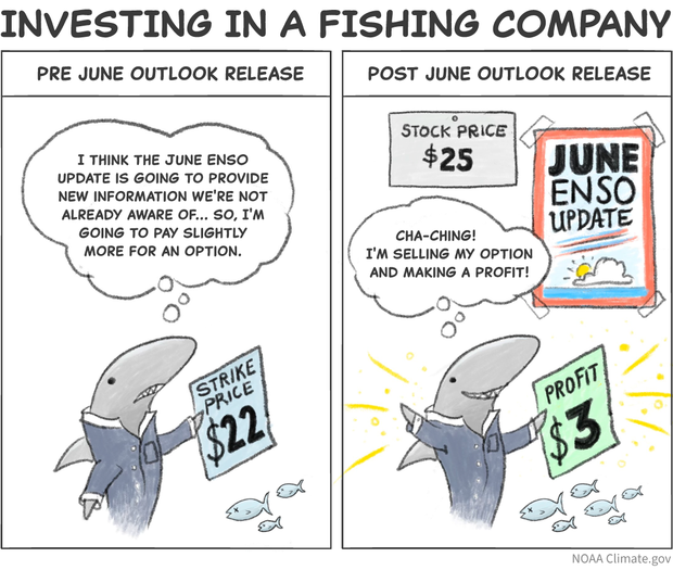 Imagine that you are investing in a fishing company whose profits are affected by the state of ENSO. Its stock price should already incorporate investors’ expectations about what NOAA’s upcoming ENSO Outlook will say. For instance, they may already think an El Niño is coming, based on past months’ outlooks. If you think that an upcoming monthly update is unlikely to have much new to say, then that upcoming monthly update does not make you willing to pay much more for an option on the firm’s stock. But what if, instead, you think that an upcoming monthly update could offer additional news about how strong that El Niño will be? The greater the potential for news that is relevant to the value of the fishing company, the more uncertain you are about what its stock price will be once the monthly update is released. You are then willing to pay more for an option to take advantage of uncertainty about the firm’s stock price induced by the ENSO Outlook.