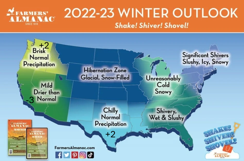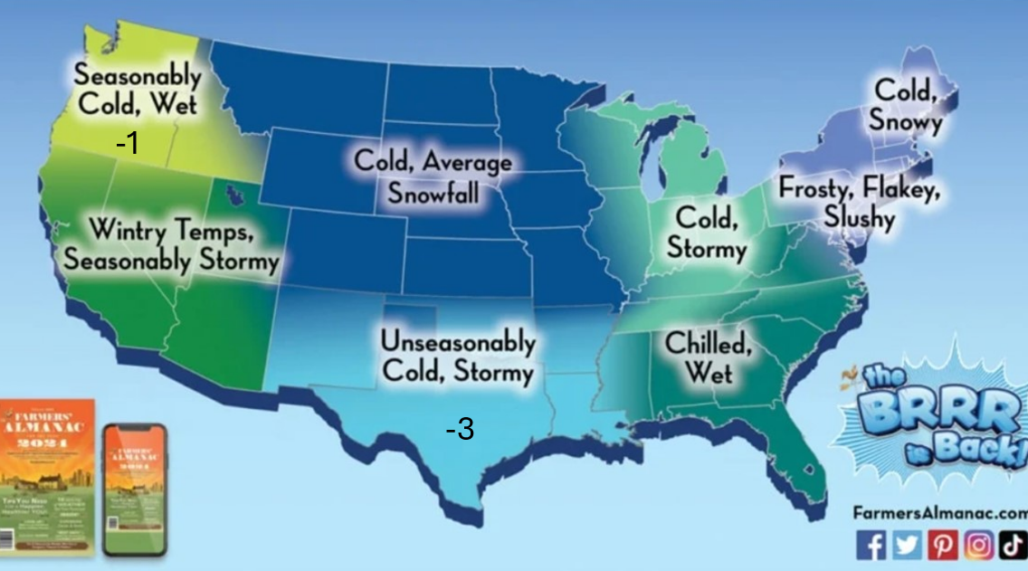 2023-2024: The Farmer’s Almanac only floundered in the final year of competition, calling for ”unseasonably cold” conditions in the South-Central Region (it was warmer than normal: -3) and ”seasonably cold” conditions in the Pacific Northwest (also warmer than normal: -1).