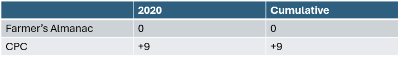 At the end of one round, the scoreboard reads CPC: 9, Farmer’s Almanac: 0 with the CPC achieving the maximum possible score for the round. Is hope lost for the Farmer’s Almanac already? With four of five years remaining, I doubt it!