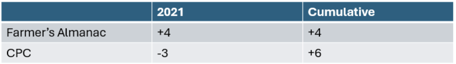 Three years of data and 11 total testable claims was enough for the CPC to begin to pull away from the Farmer’s Almanac with cumulative scores of +15 for the CPC, and +4 for the Farmer’s Almanac.