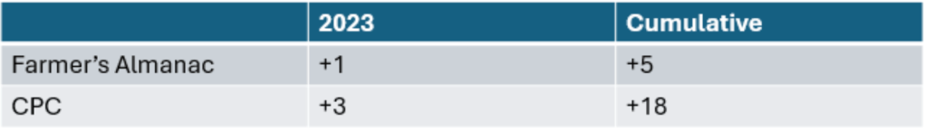 Neither the Farmer’s Almanac nor the CPC had a particularly strong showing in 2022-2023, netting only +1 and +3. After four years, the cumulative scores are +18 for the CPC and +5 for the Farmer’s Almanac. With just one year left in our forecast competition, it would take a crystal ball for the Farmer’s Almanac to make up that kind of a deficit.
