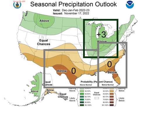2022-2023: The winter 2022-2023 season brought the third year in a row of La Niña conditions. The prevailing evidence suggests that this is associated with wetter than normal conditions over the northern United States, especially the Great Lakes Region, and drier than normal conditions over the south and southwestern United States. Much warmer than normal Atlantic Ocean temperatures also lent confidence, at least for the CPC, that a warmer than normal winter could occur up and down the eastern seaboard.