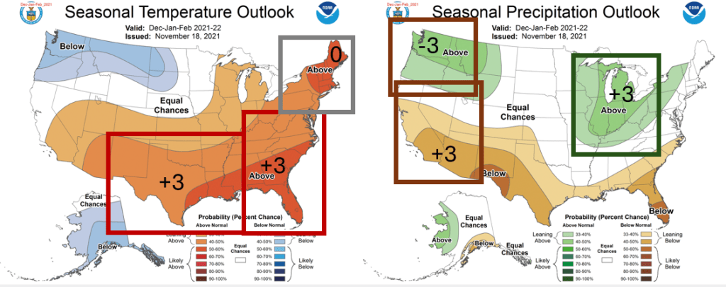 How about the CPC? Given our stated methods, this time, we must test their two most confident regional temperature forecasts. This includes an increased chance of above normal temperatures for the Southwest and South-Central Regions. The Southwest saw near-normal winter temperatures. The Farmer’s Almanac called it. The CPC did not. Does it get better for the CPC from here? Oh no! The CPC’s call for increased chances of a warmer than normal winter in the South-Central Region will not amuse Texans, who had disastrous, and sometimes deadly, impacts from a horrible cold snap in February 2021, which saw millions of Americans without power. This earns the CPC an emphatic –3.
