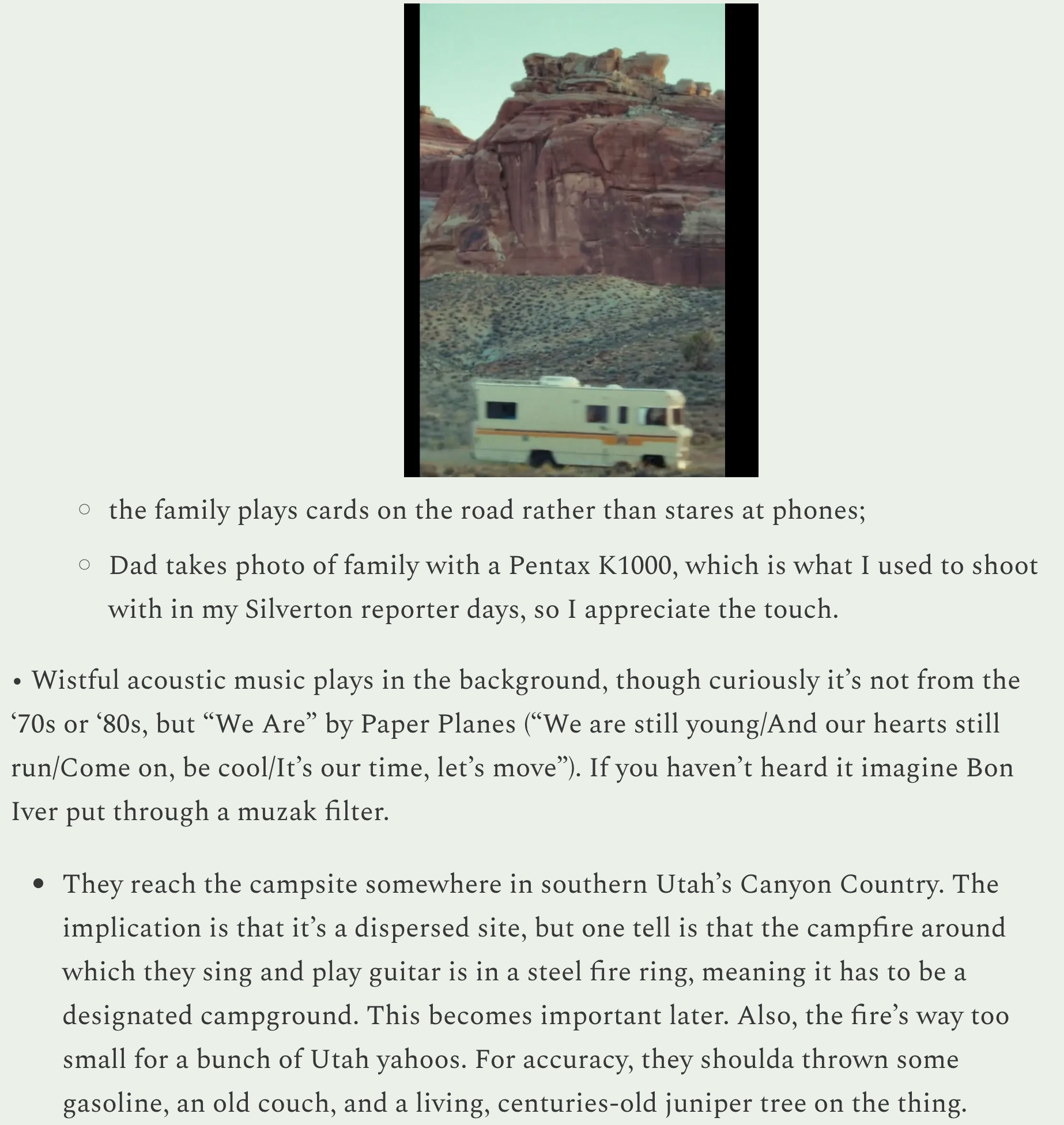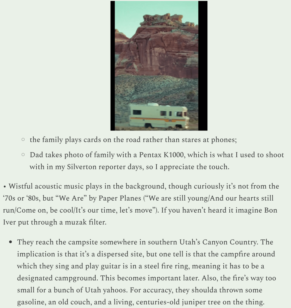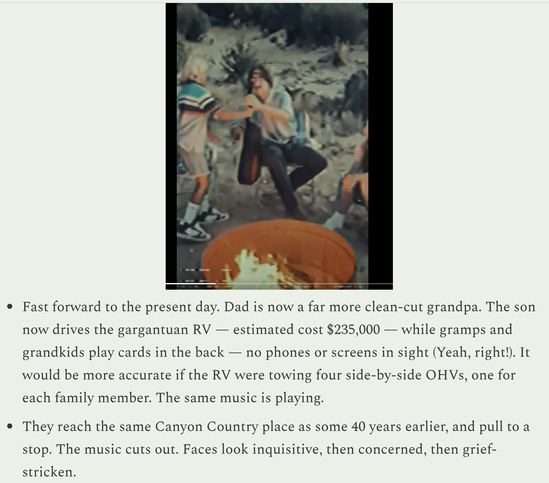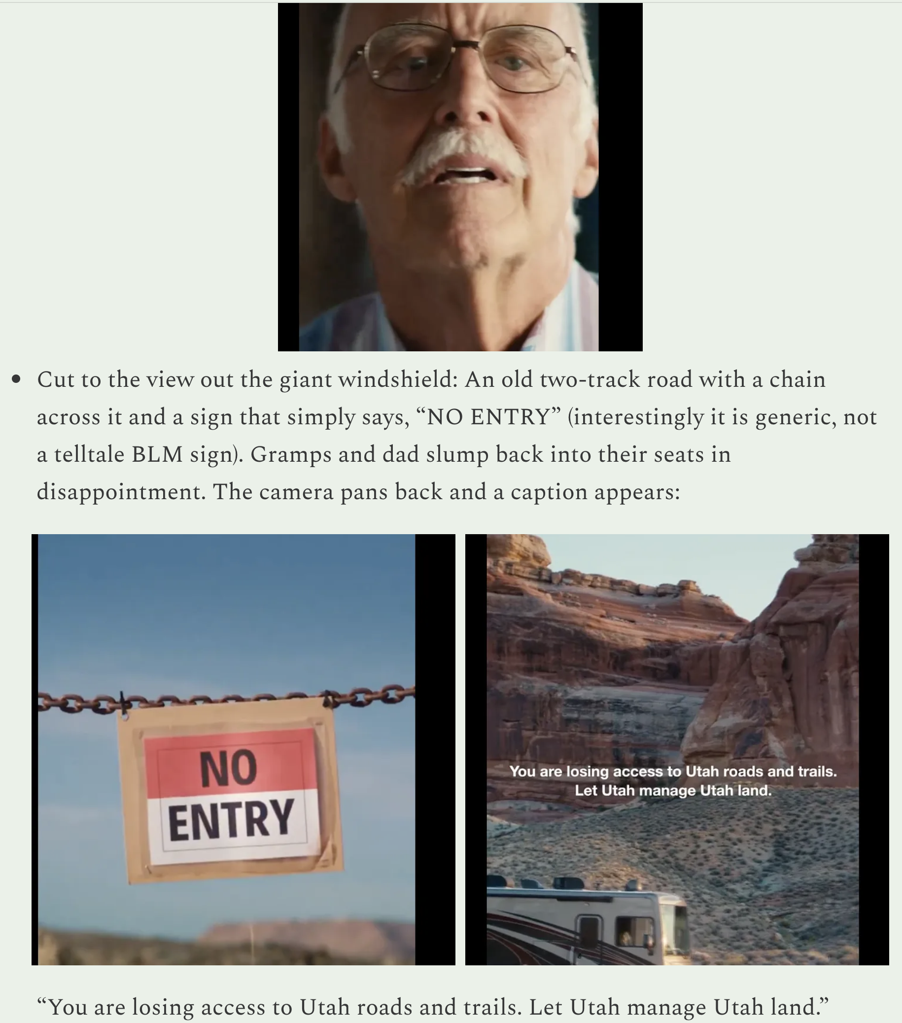 The ad is overflowing with misinformation, but it tugs at the heartstrings and evokes that faux nostalgia, which is the objective, I guess. It does harken back to the wrong era, though: The Sagebrush Rebels’ glory days ended in 1976, when Congress passed the Federal Land Policy Management Act, and when President Jimmy Carter vowed to end the Western “rape, ruin, and run” ethos. And, besides, I’m pretty sure no RV-appropriate roads are being closed anywhere in Utah. The handful of routes that are going non-motorized are in the backcountry, and are mostly used by OHVs.