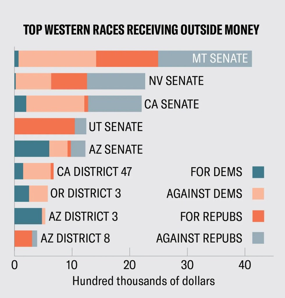 SOURCES: OpenSecrets, Federal Election Commission, Ballotpedia, Grand Junction Daily Sentinel, Colorado Newsline, Arizona Agenda, Utah News Dispatch, KJZZ, Politico. Data for the charts was collected by Colorado College State of the Rockies Project 2024 from Arizona, Colorado, Idaho, Montana, Nevada, New Mexico, Utah and Wyoming.