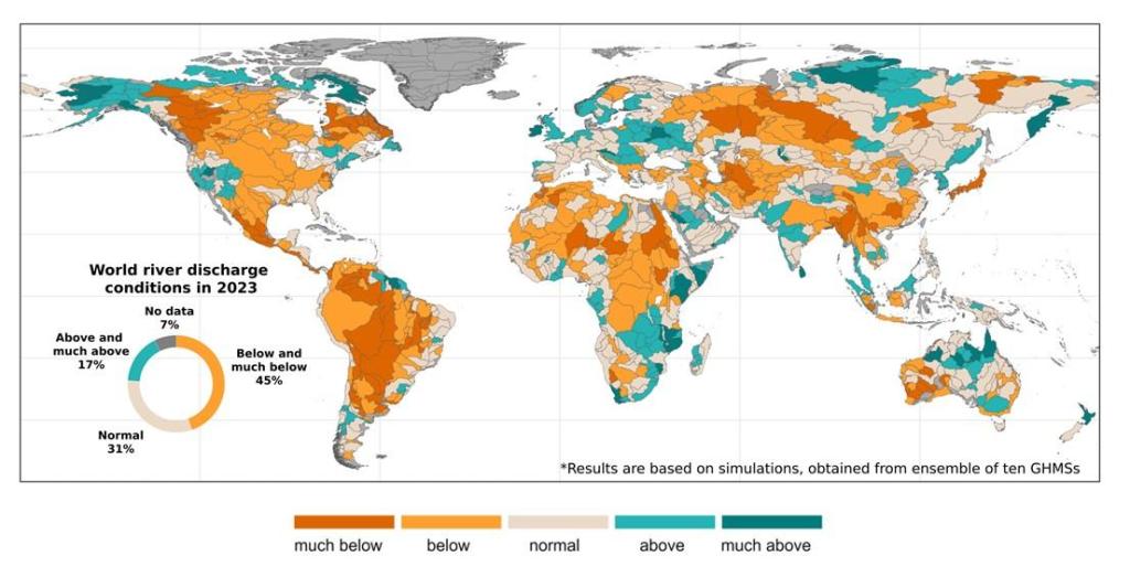 The year 2023 was marked by mostly drier-than-normal to normal river discharge conditions compared to the historical period. Similar to 2022 and 2021, over 50% of global catchment areas showed abnormal conditions, with most of them being in deficit. Fewer basins showed above normal conditions.