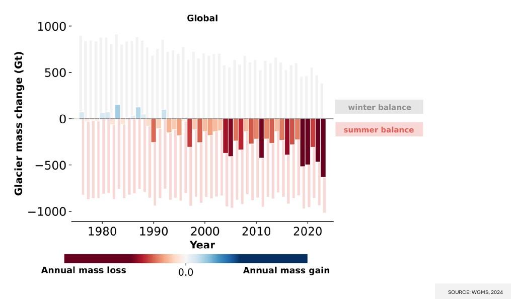Glaciers suffered the largest mass loss ever registered in the last five decades. 2023 is the second consecutive year in which all regions in the world with glaciers reported iceloss.