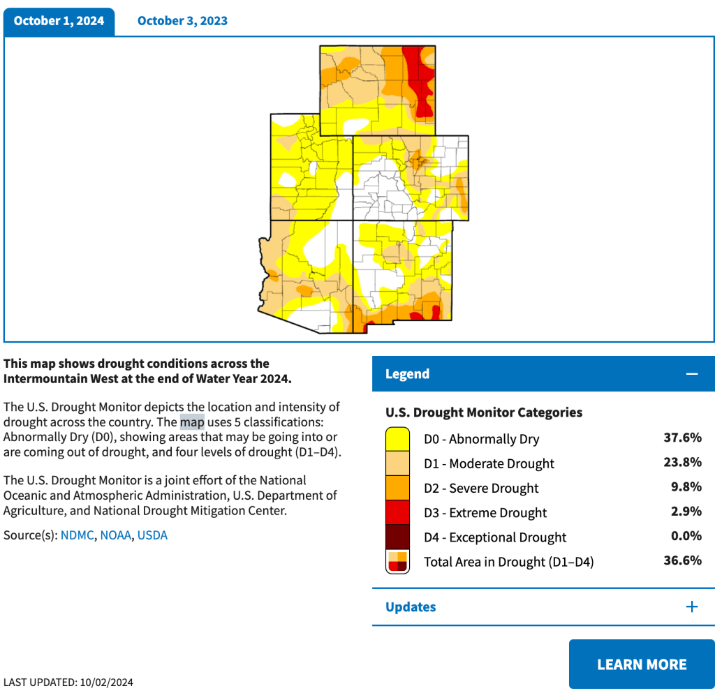 - Roughly the same percentage of the Intermountain West was in drought at the start of Water Year 2024 (38.27%), as the start of Water Year 2025, October 1, 2024 (36.55%). However, drought conditions shifted across the region. At the onset of Water Year 2024, 94.86% of New Mexico was in Moderate to Exceptional Drought (D1–D4) and 0.0% of Wyoming was in drought. Drought has increased in Wyoming to 71.33% and improved in northern/central New Mexico (now covering only 34.73% of the state), eastern Arizona, and southwestern Colorado.