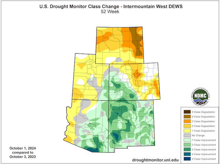 Figure 1: Intermountain West Water Year 2024 Drought Change Map: October 3, 2023–October 1, 2024