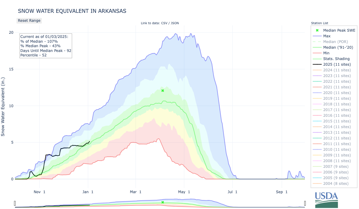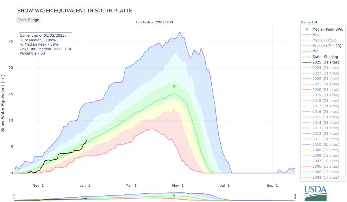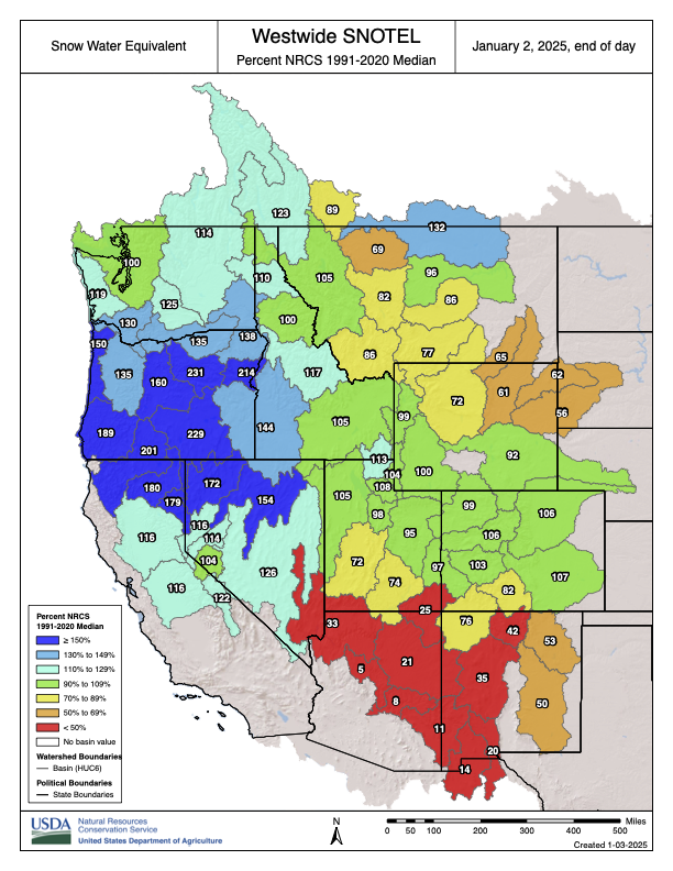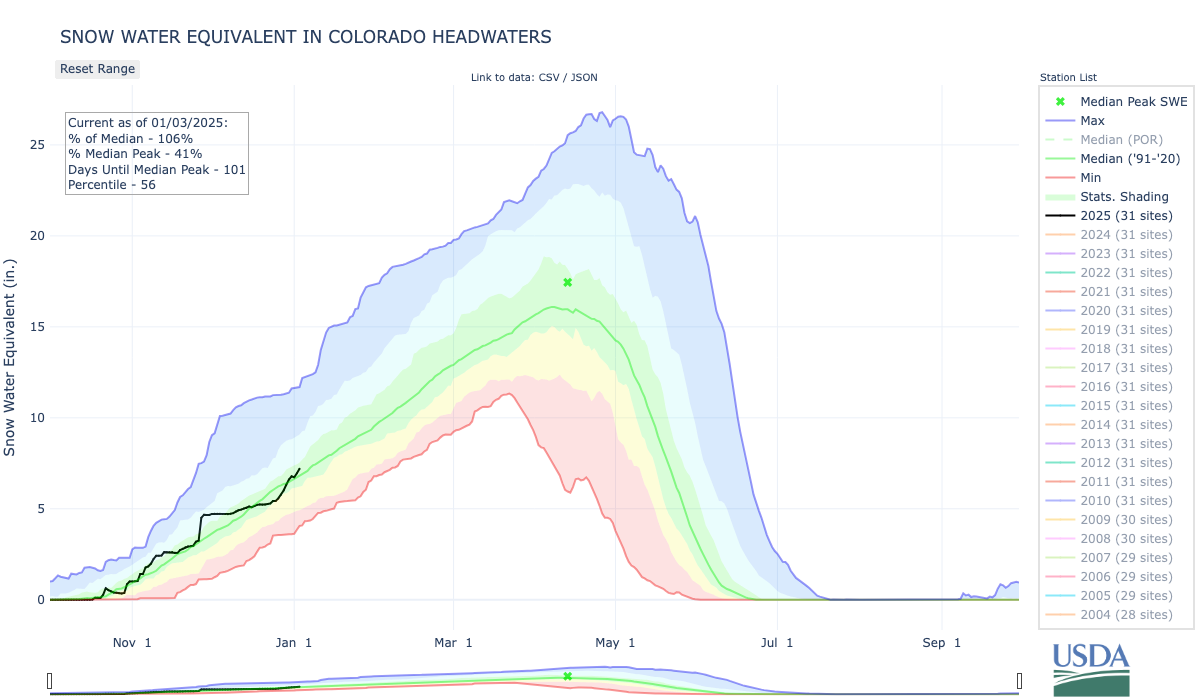 Deflated snowpack levels are beginning to rise again in Colorado after nearly a month of stagnation…A cycle of heavy snow storms in November sent snowpack levels surging well above normal, particularly in the state’s southern regions. But as conditions dried after Thanksgiving, levels flatlined…As of mid-December, statewide snowpack levels have tracked below the 30-year median and even began to approach historical lows for this time of year. But a smattering of storms in the High Country since Christmas have begun to reverse the trend…As of Friday [December 27, 2024], statewide snowpack stood at 87% of the 30-year median, according to data from the Natural Resources Conservation Service. The Arkansas River Basin, which encompasses south-central Colorado, is the only basin in the state with snowpack currently above 100%.