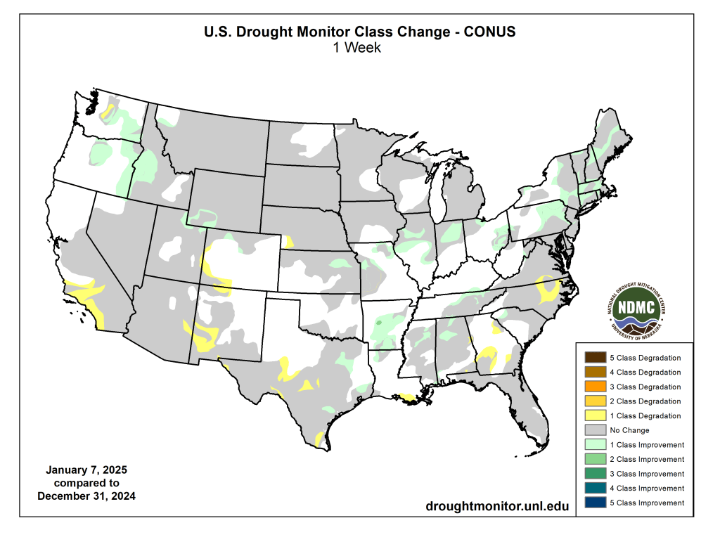 US Drought Monitor one week change map ending January 7, 2025.