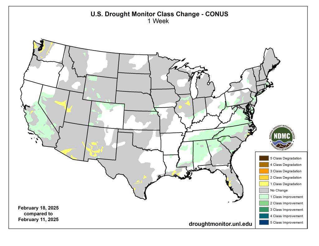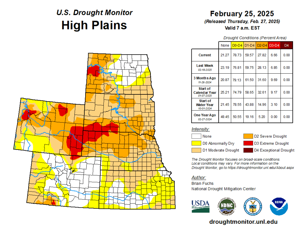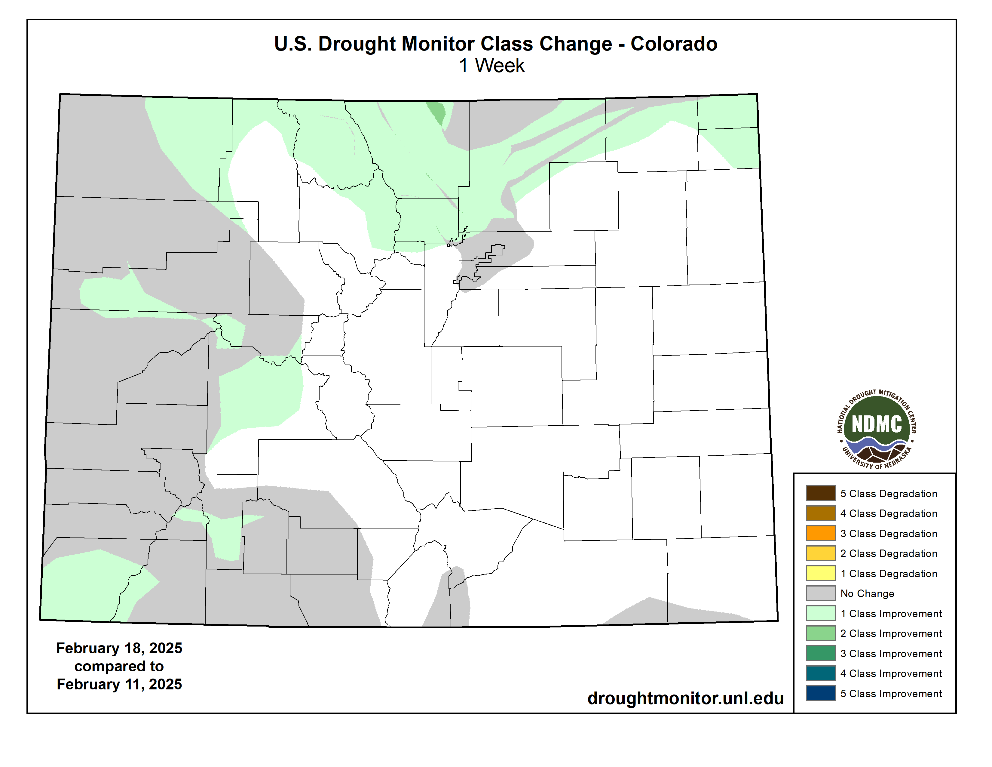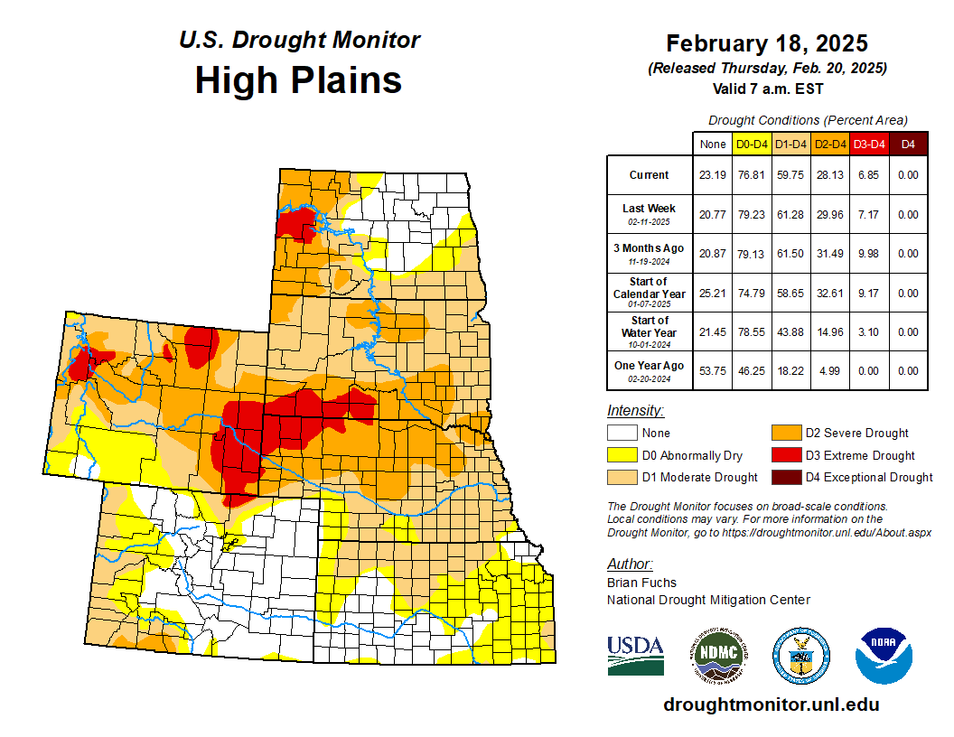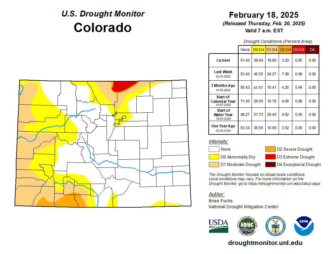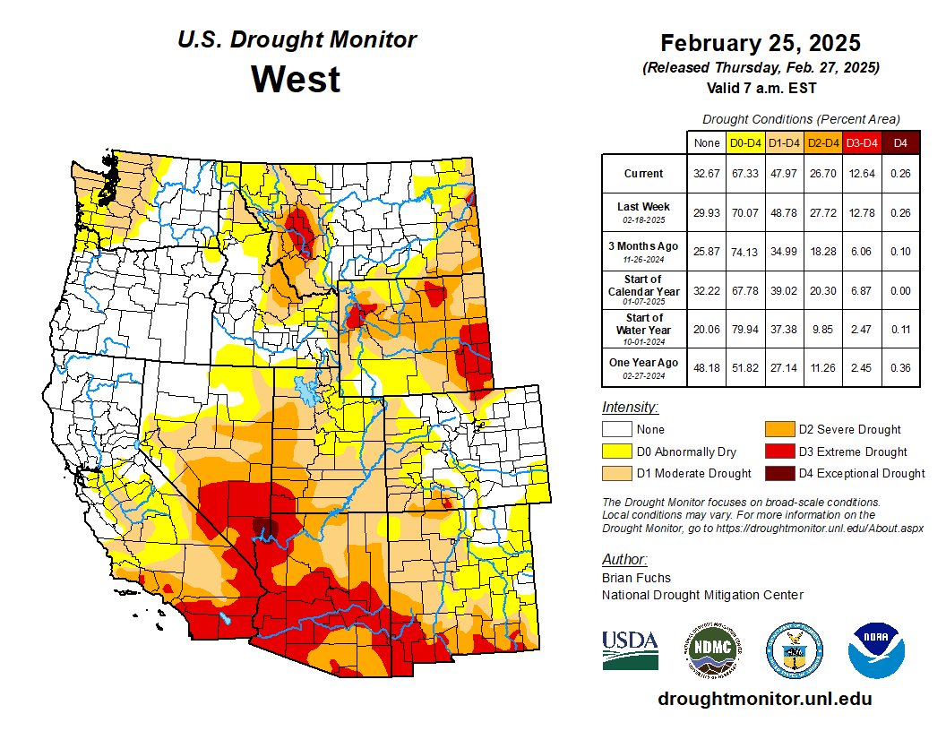 Regional drought coverage increased in January and now, as of February 4th, covers 56% of the region, compared to 39% in early January. Drought coverage nearly quadrupled in Utah and doubled in Colorado, while Wyoming saw a slight decrease in drought coverage. In Colorado, moderate (D1) drought expanded in the West Slope and severe (D2) drought developed in the southwest. In Utah, D1 drought expanded across the state, D2 drought expanded in the southwest, and extreme (D3) drought developed in the southwest. Despite Wyoming still experiencing over 80% drought coverage, there was a slight improvement in drought conditions across the state in January.