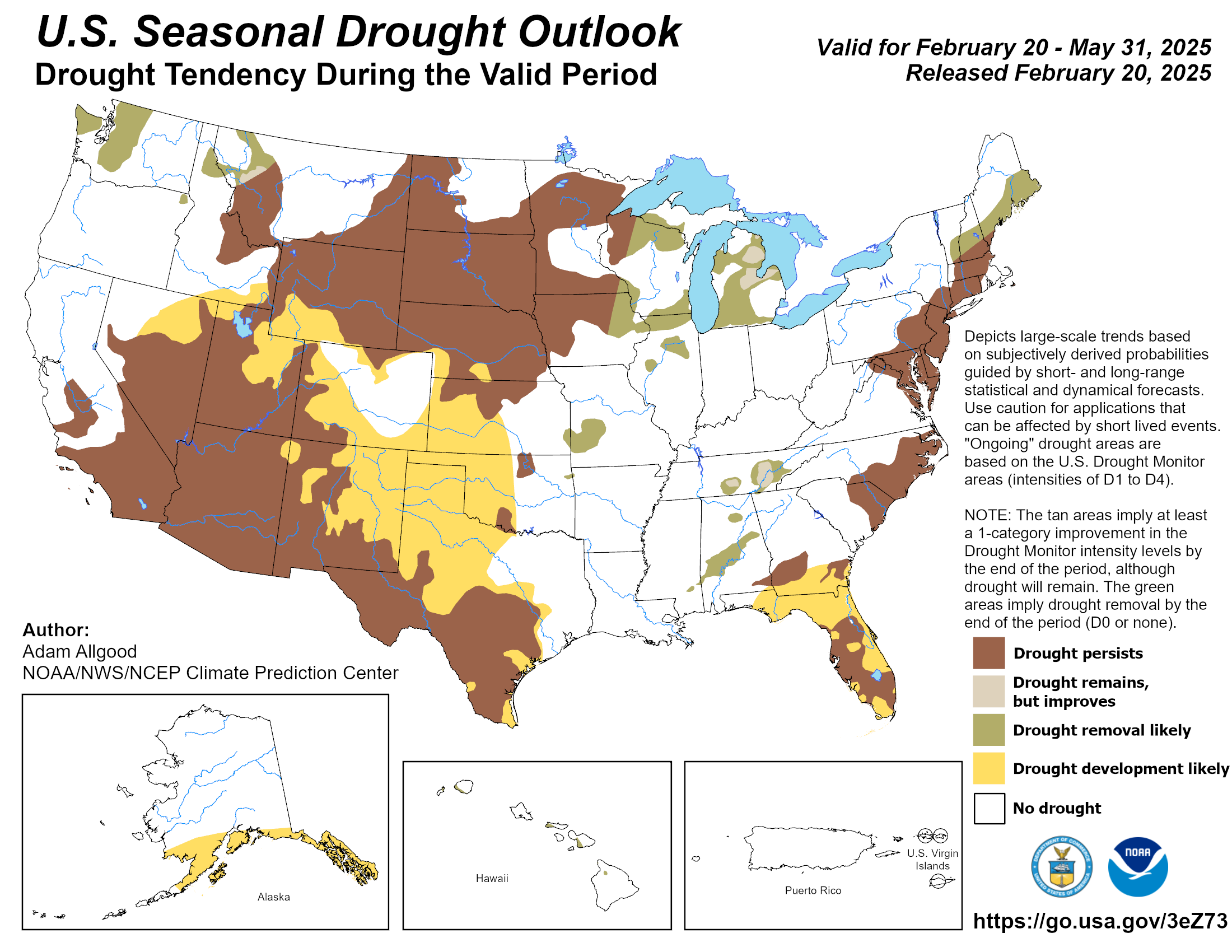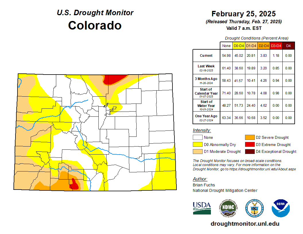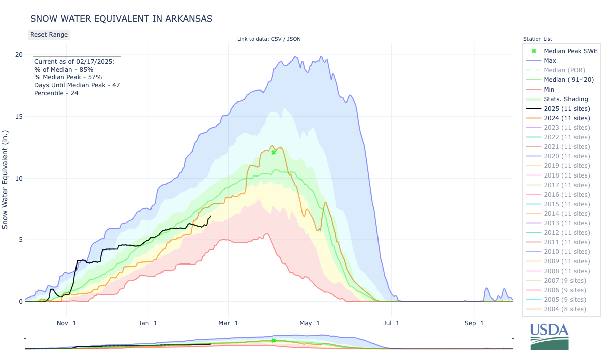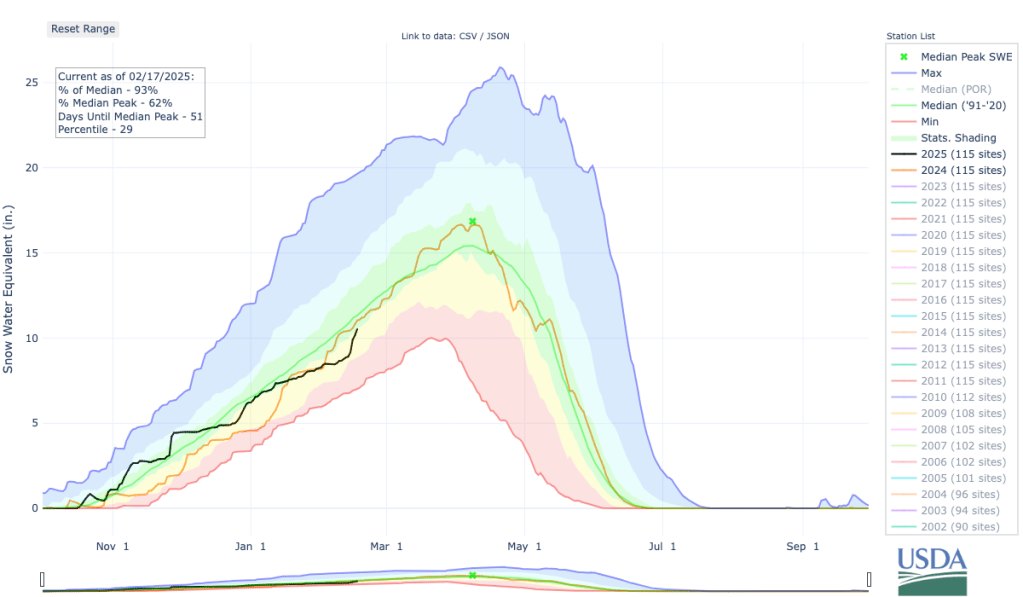 In January, precipitation varied across the region, from much below average conditions in Utah and western Colorado to much above average conditions in eastern Colorado and southeastern Wyoming. January temperatures were colder than usual, especially in Colorado and Wyoming where temperatures were 6 to 10ยฐF below average. Snow-water equivalent (SWE) was generally below normal, particularly in southern Utah and southwestern Colorado. Seasonal streamflow forecasts for February 1st indicate below average runoff for much of the region, with the worst forecasts for Utah. Drought coverage increased across the region, affecting 56% of the region as of February 4th. La Niรฑa conditions emerged in the Pacific Ocean but are expected to transition back to ENSO-neutral by spring 2025. NOAA seasonal forecasts for February-April suggest an increased probability of below average precipitation for the majority of the region.