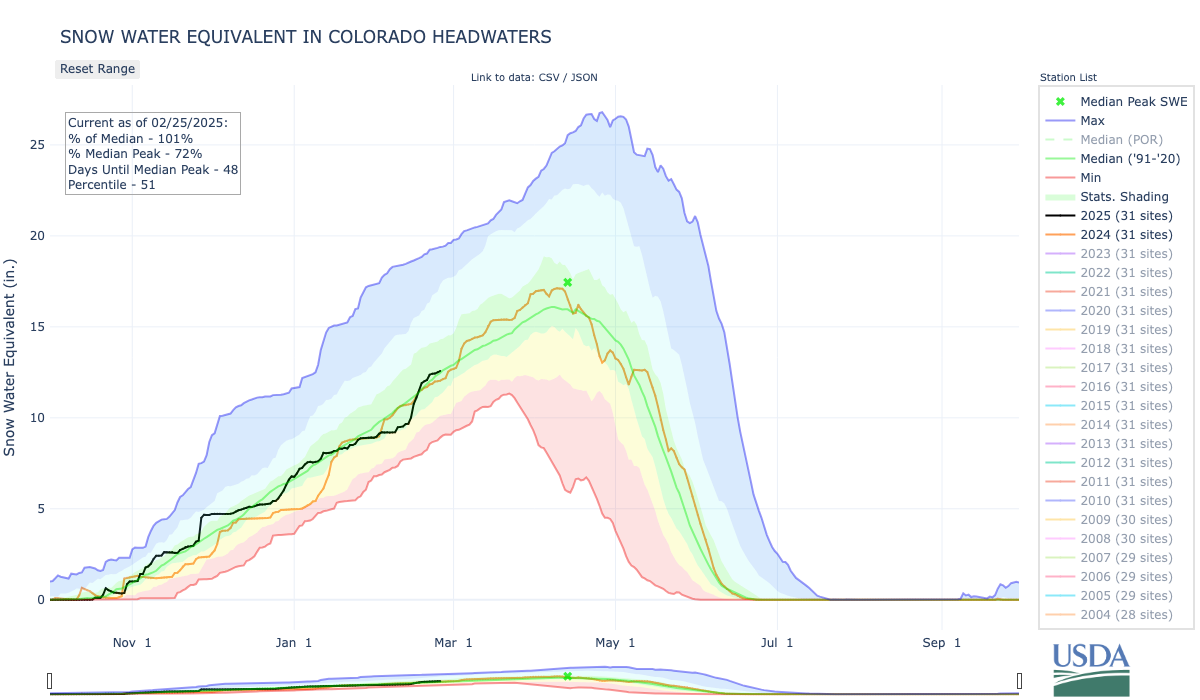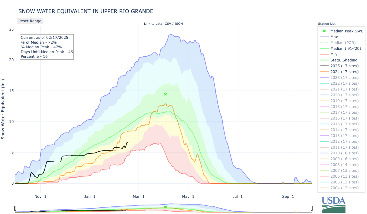 In southwest Colorado, snowpack in the San Miguel, Dolores, Animas and San Juan basins is at only 61% of median. The Upper Rio Grande Basin, similarly, sits at 64% of median.