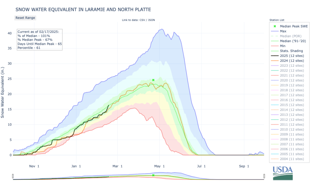 After many months of ENSO-neutral conditions, La Niรฑa conditions emerged during January. These conditions will most likely be short-lived as there is a 60-70% probability of ENSO-neutral conditions emerging by spring 2025. NOAA monthly forecasts for February suggest an increased probability of above average precipitation for northern Utah and western Wyoming, above average temperatures for southeastern Utah and southwestern Colorado, and below average temperatures for northeastern Wyoming. NOAA seasonal forecasts for February-April suggest an increased probability of below average precipitation for the majority of the region, below average temperatures for northern and eastern Wyoming, and above average temperatures for southern Utah and southwestern Colorado.
