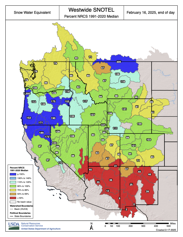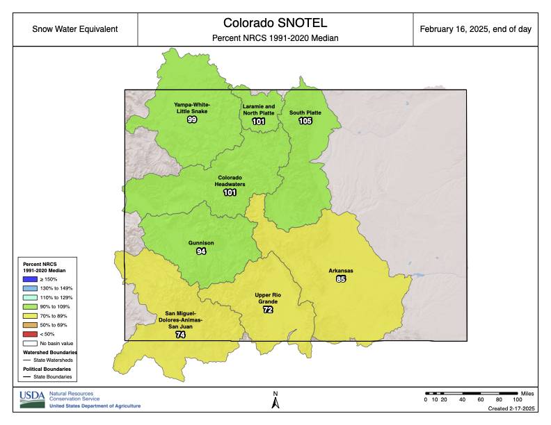 A map from the U.S. Department of Agricultureโs National Water and Climate Center shows Colorado snowpack levels as of Feb. 9, 2025, compared to the median recorded from 1991 to 2020. (Image courtesy of National Water and Climate Center)