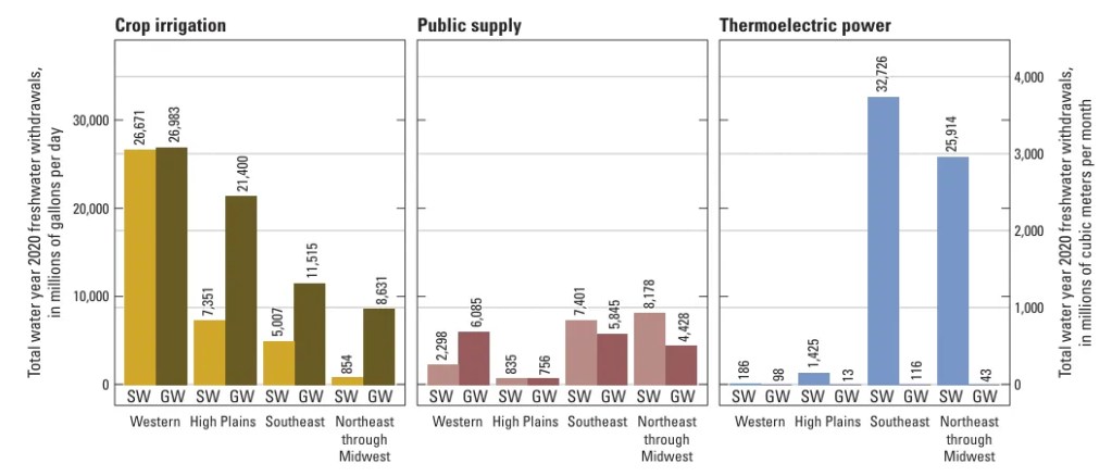Most of what it says won’t be too surprising to Land Desk readers. Demand exceeds supply in swaths of the Southwest, and climate change threatens to exacerbate the imbalance. Irrigated agriculture is by far the biggest water guzzler nationwide, with Western farms consuming more than those in any other region. Municipal water consumption is staying fairly flat, even as populations increase. Thermoelectric power plants withdraw massive amounts of water, but then return much of it to the water body, keeping consumptive use relatively low.