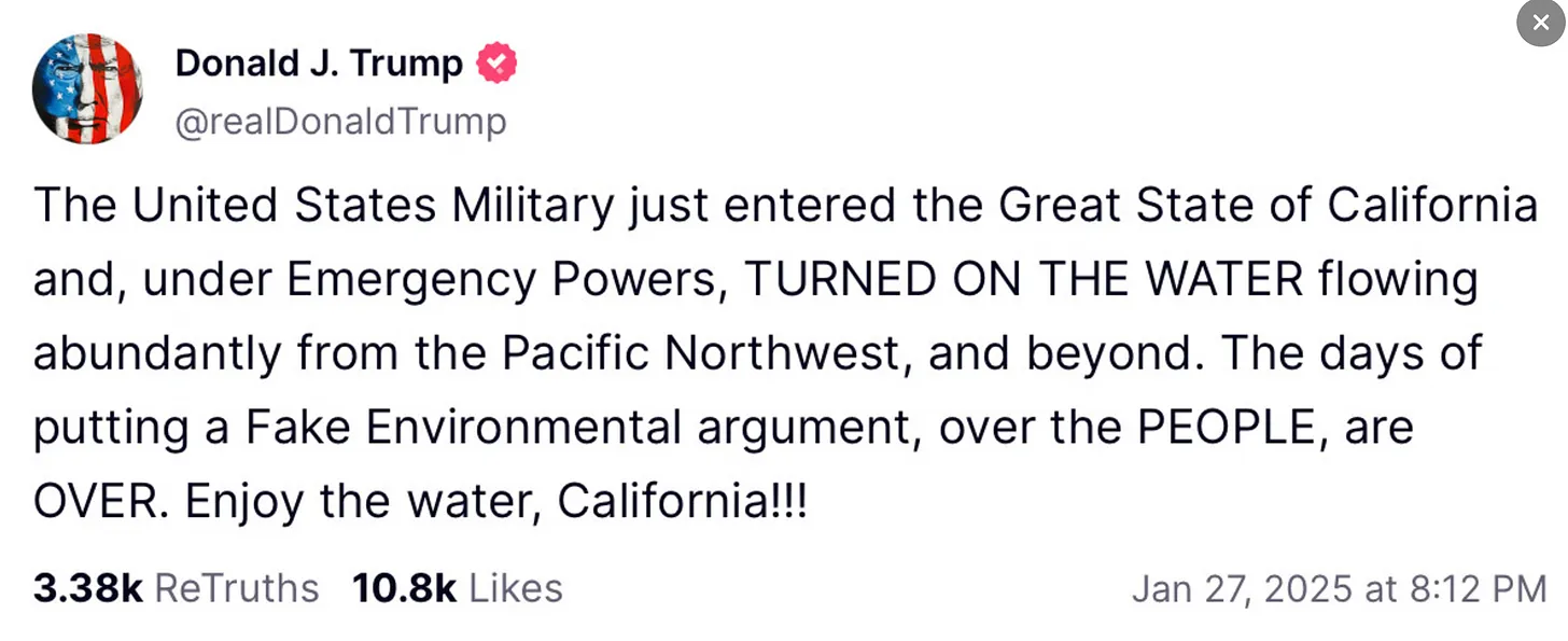 Whaaaaaaat!?! I guess all that water assessment stuff is irrelevant, now, eh? I mean, here we’ve all been fretting about the Colorado River, and little did we know that Trump could make it all irrelevant by sending the military in to turn some valve somewhere and deliver all the water from the Pacific Northwest directly to the fire hydrants of L.A.