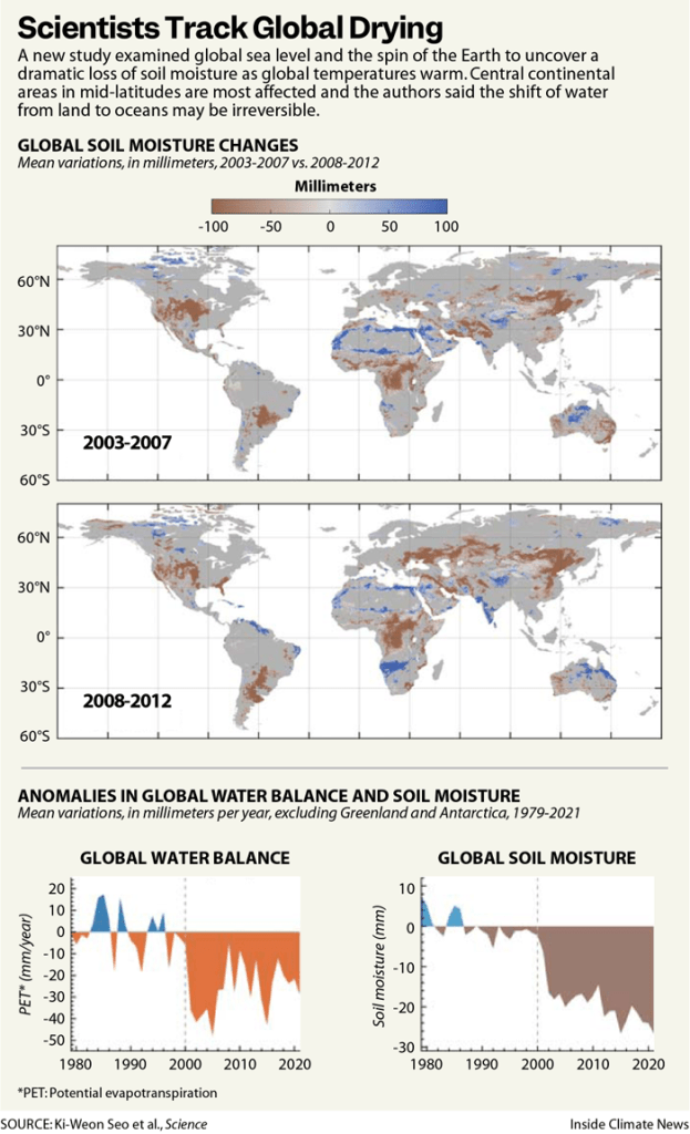 Researchers comparing satellite measurements of the planet’s water with the wobble in its rotation identified a steady loss of global soil moisture.