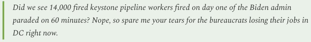 First off, Biden didn’t fire anyone. He cancelled a permit for the Keystone XL pipeline, which led the developer, TC Energy, to abandon the project and lay off about 1,000 temporary construction workers. While DOGE is slashing jobs as an end in itself, Biden cancelled the permit because: