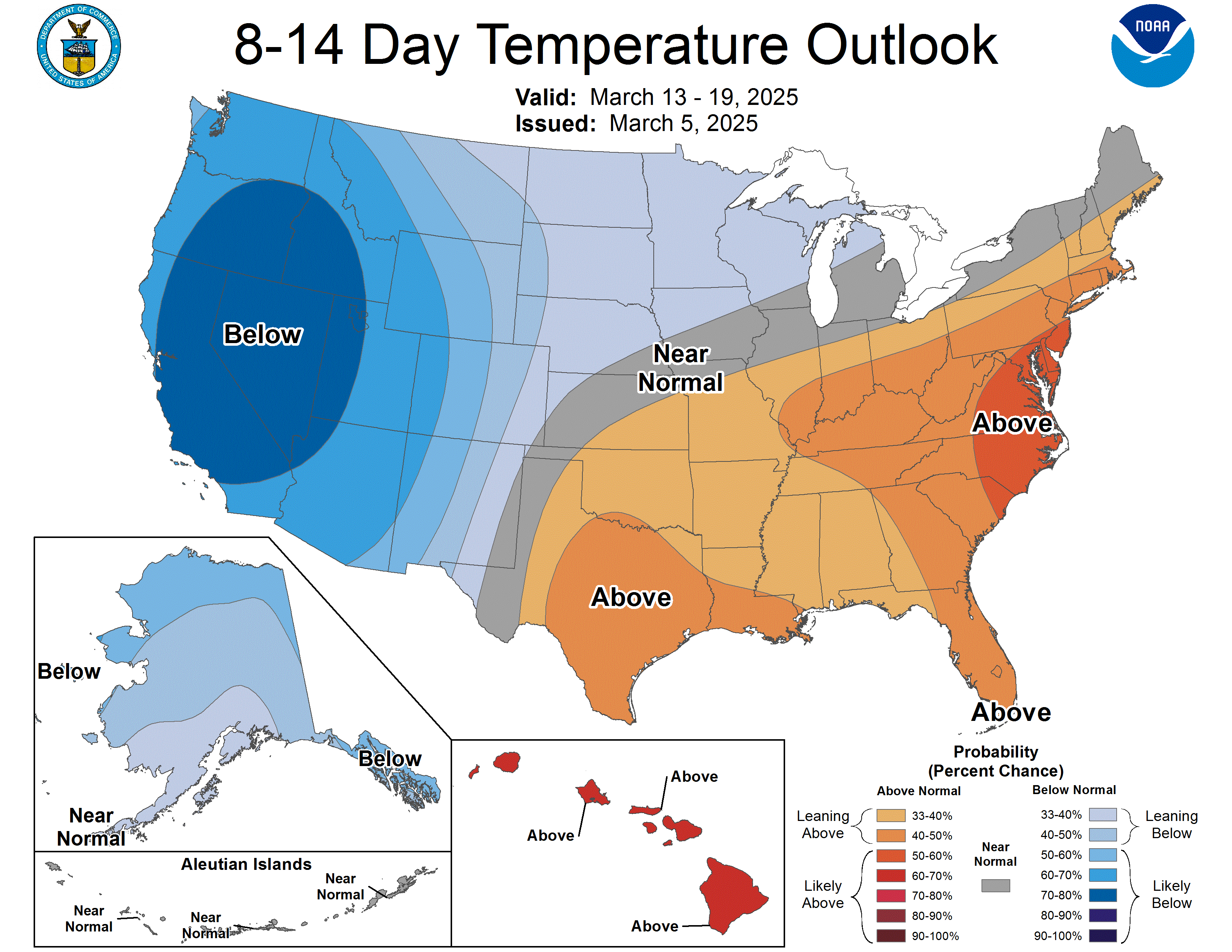 Looking ahead to March 11-15, the National Weather Service Climate Prediction Center forecast favors above-normal precipitation in the northern Contiguous U.S. and strongly favors above-normal precipitation in the western, and especially southwestern, U.S. Below-normal precipitation is favored in most of Texas, especially in far southern reaches of the state. Colder-than-normal temperatures are favored across the West, while warmer-than-normal weather is favored across most of the central and eastern Contiguous U.S.