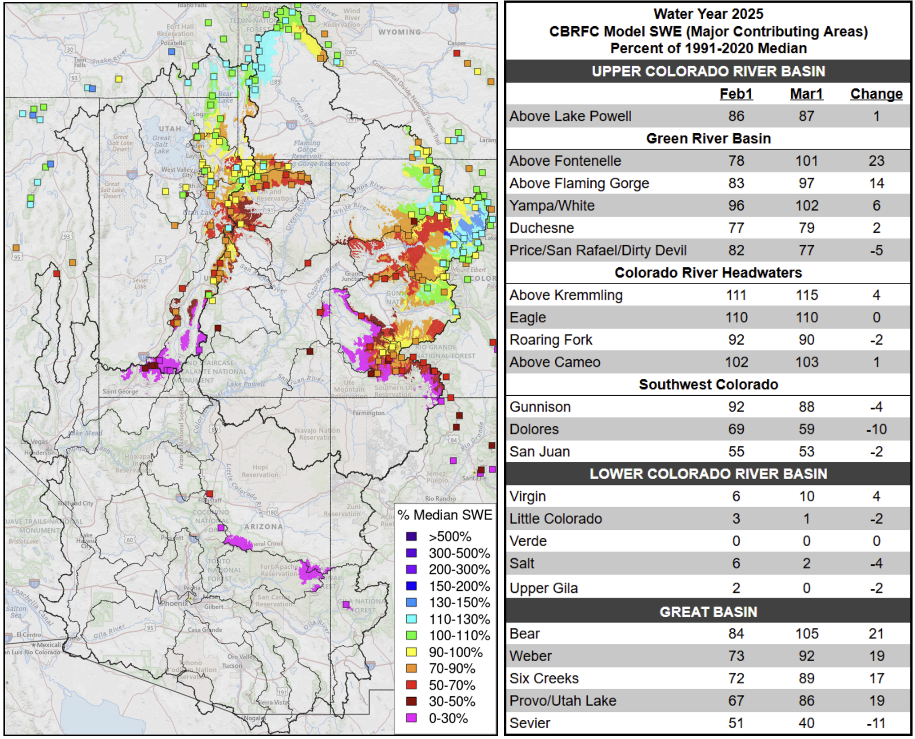 Precipitation fell across higher elevations of California, northern Idaho and western areas of Oregon and Washington this week. For the most part, drier weather occurred elsewhere. Temperatures were warmer than normal in most of the West, with the warmest conditions of 9-15 degrees above normal occurring in the central and eastern plains of Montana. Recent improvements to snowpack in northeast Nevada, Idaho and southwest Montana led to localized improvements to drought conditions. Meanwhile, to the south across Utah, Arizona and New Mexico, this weekās continued dry weather led to widespread drought degradation as short- and long-term precipitation deficits grew amid soil moisture, streamflow and groundwater deficits. Drought conditions are especially bad from Phoenix westward to far southeast California, where exceptional drought developed this week…