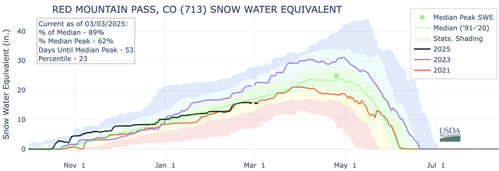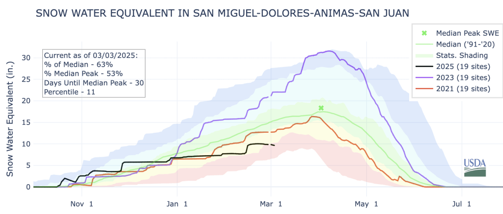 Still, the chances for a full snowpack recovery in the San Juan Mountains and southward are looking dimmer with each passing day. Spring snowfall is often accompanied by dust, which hastens melting. February was unusually warm, with monthly high-temperature records broken across the Southwest; a continuation of the trend would exacerbate drought in the lowlands and decimate the snowpack up high.
